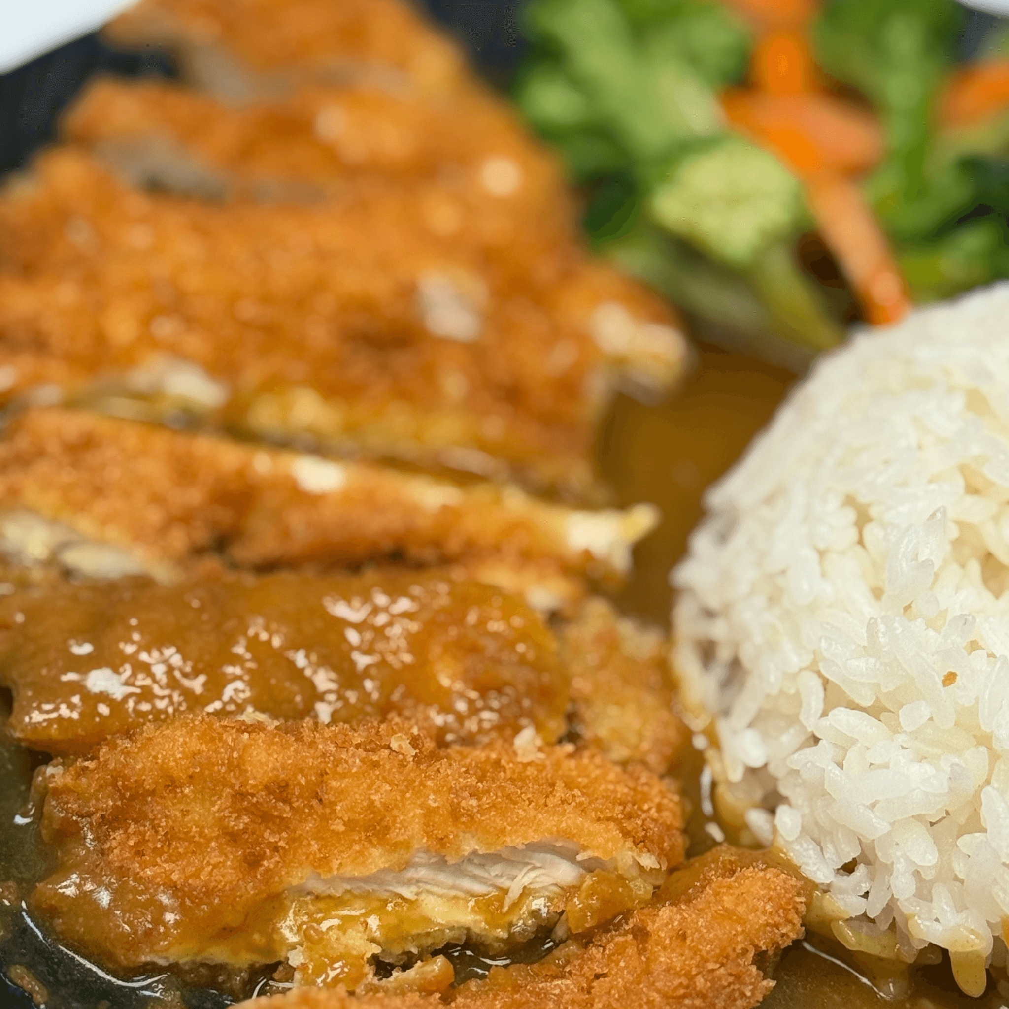 Savory Japanese curry served with panko fried chicken, potato, carrot and steamed rice