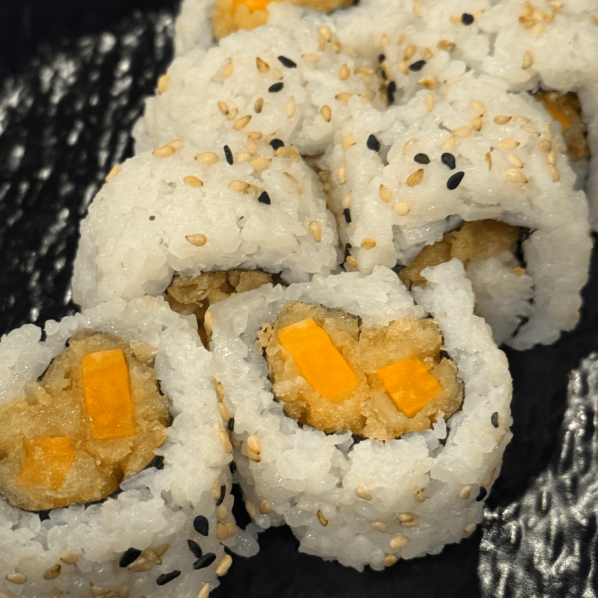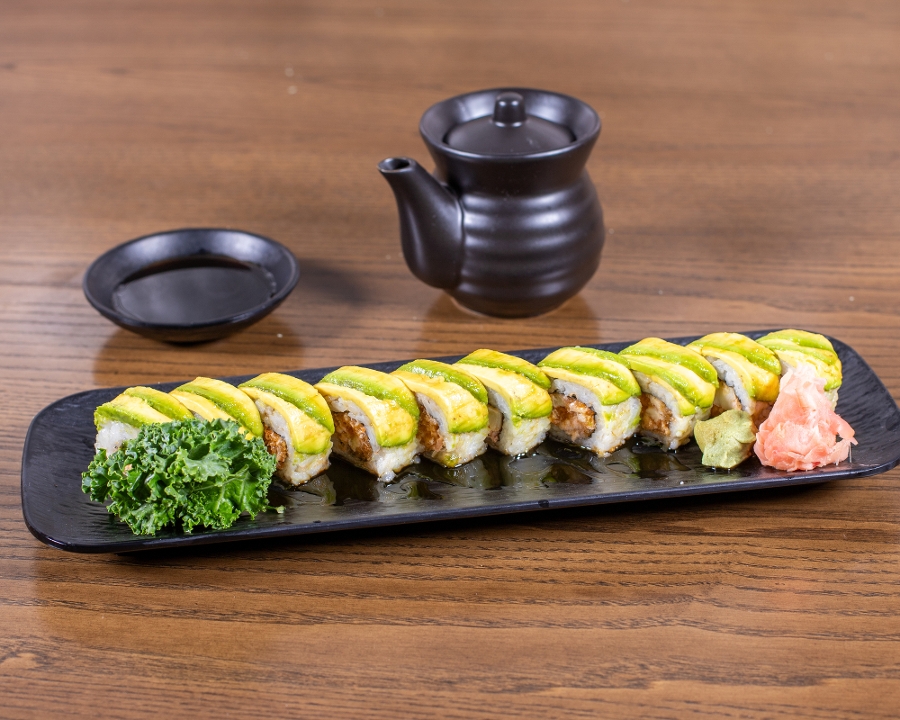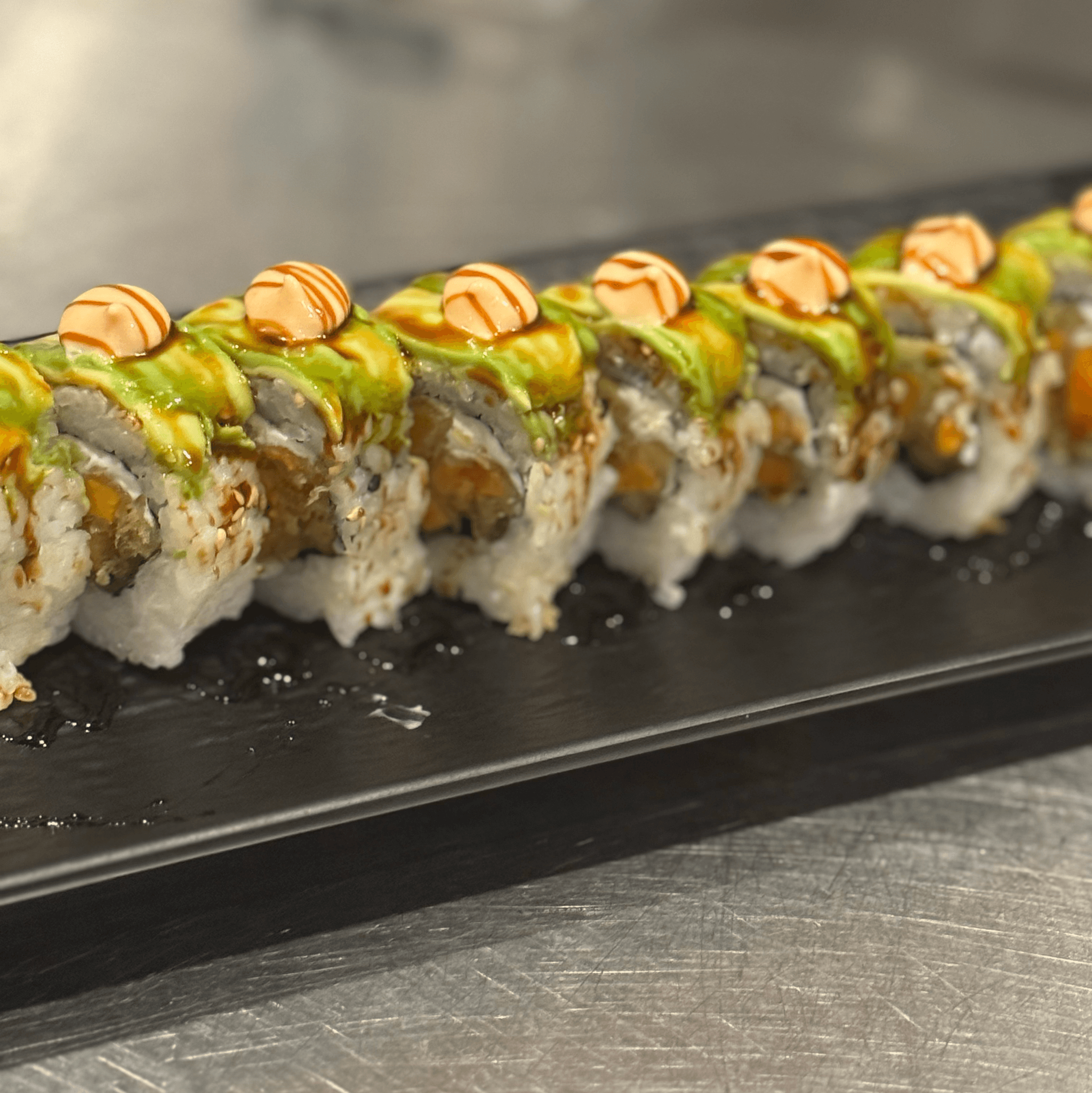 Tempura fried sweet potato and cream cheese topped with sliced avocado, spicy mayo, and eel sauce.