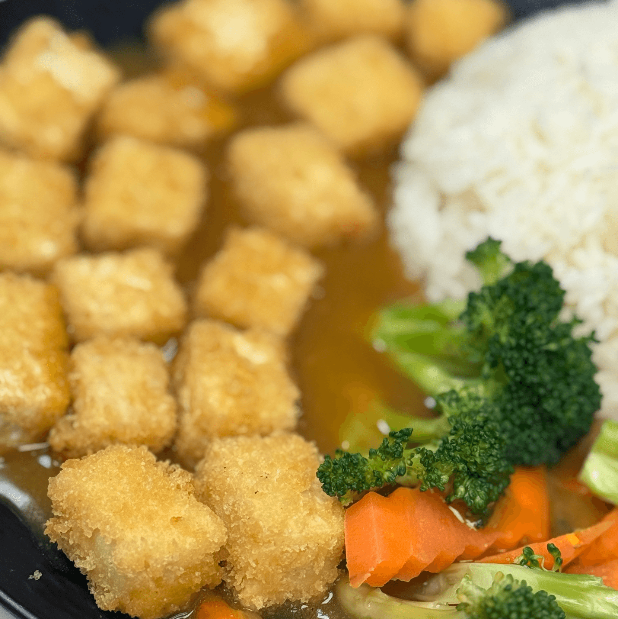 Savory Japanese curry served with Fried tofu , potato, carrot and white rice