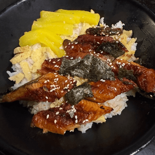 Grilled fresh water eel glazed with sweet soy base sauce served over white rice.