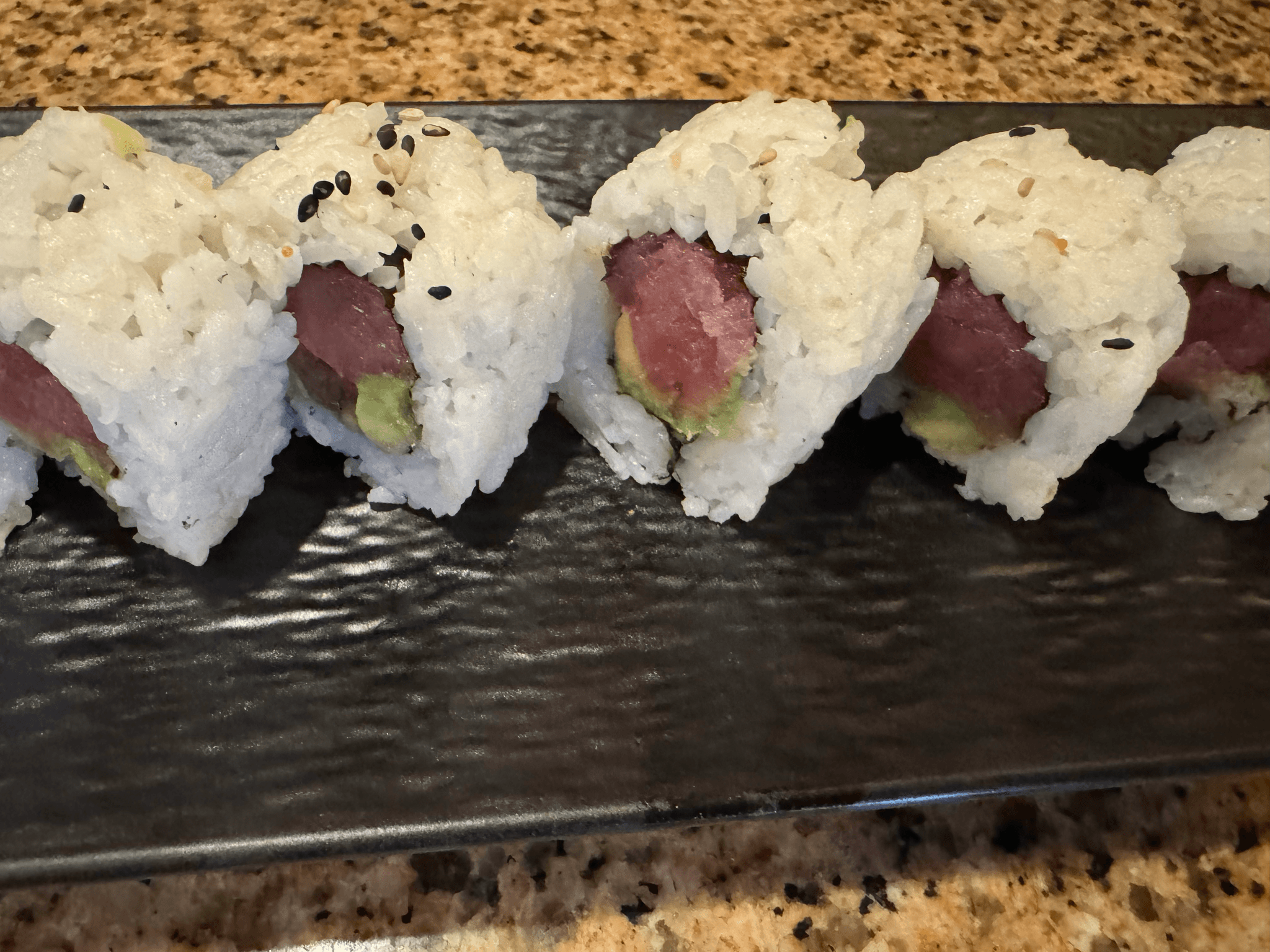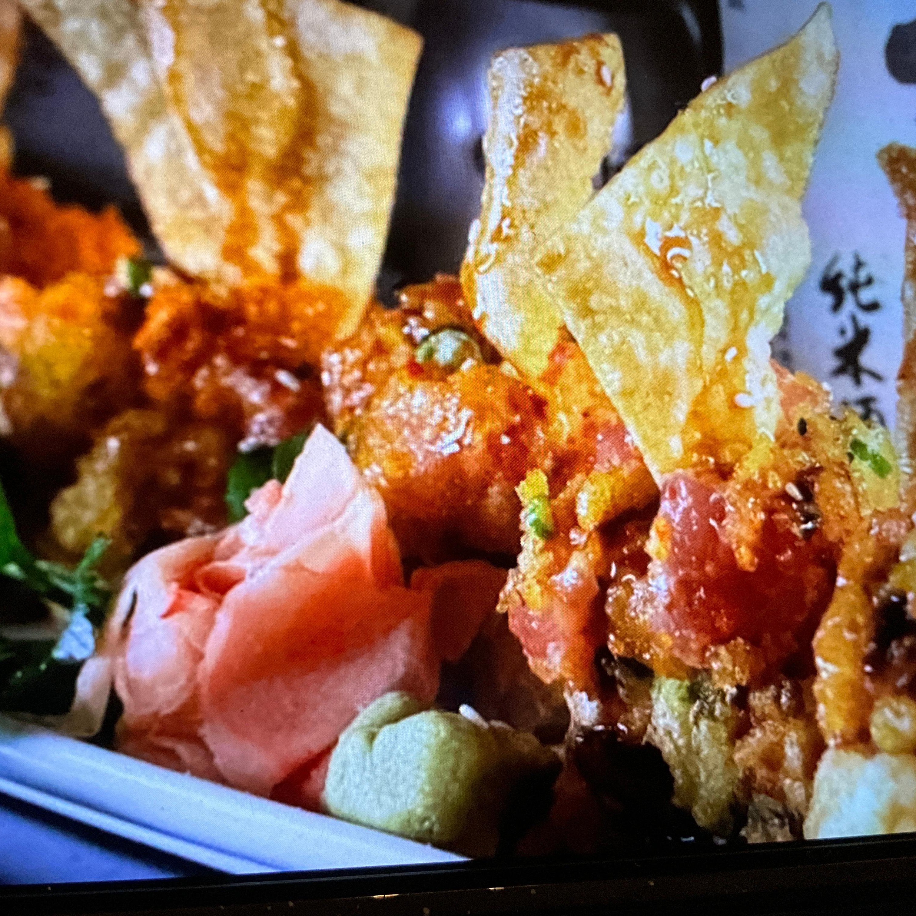 Tempura fried shrimp and imitation krab rolled into a sushi roll then topped with fresh tuna, spicy mayo, and eel sauce.