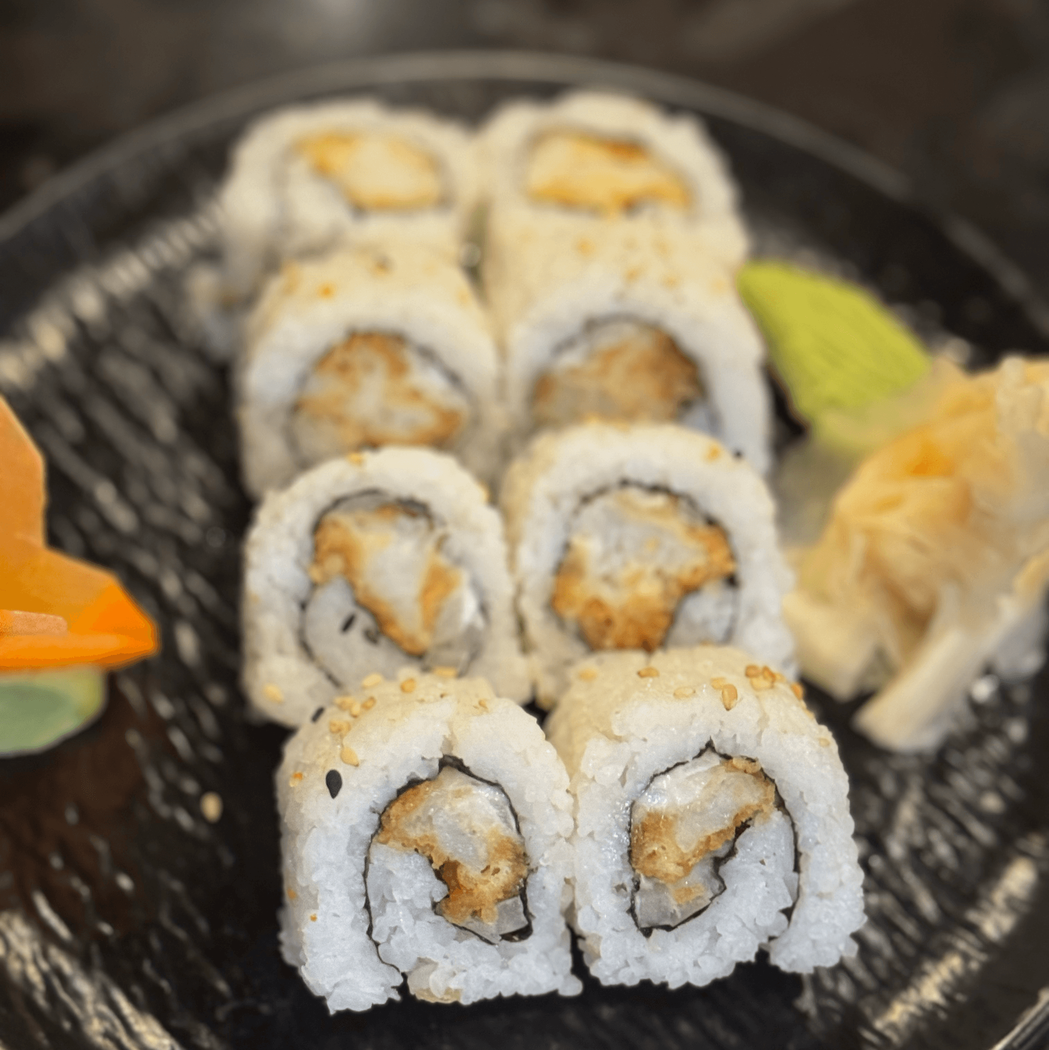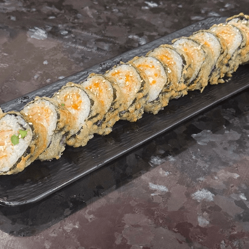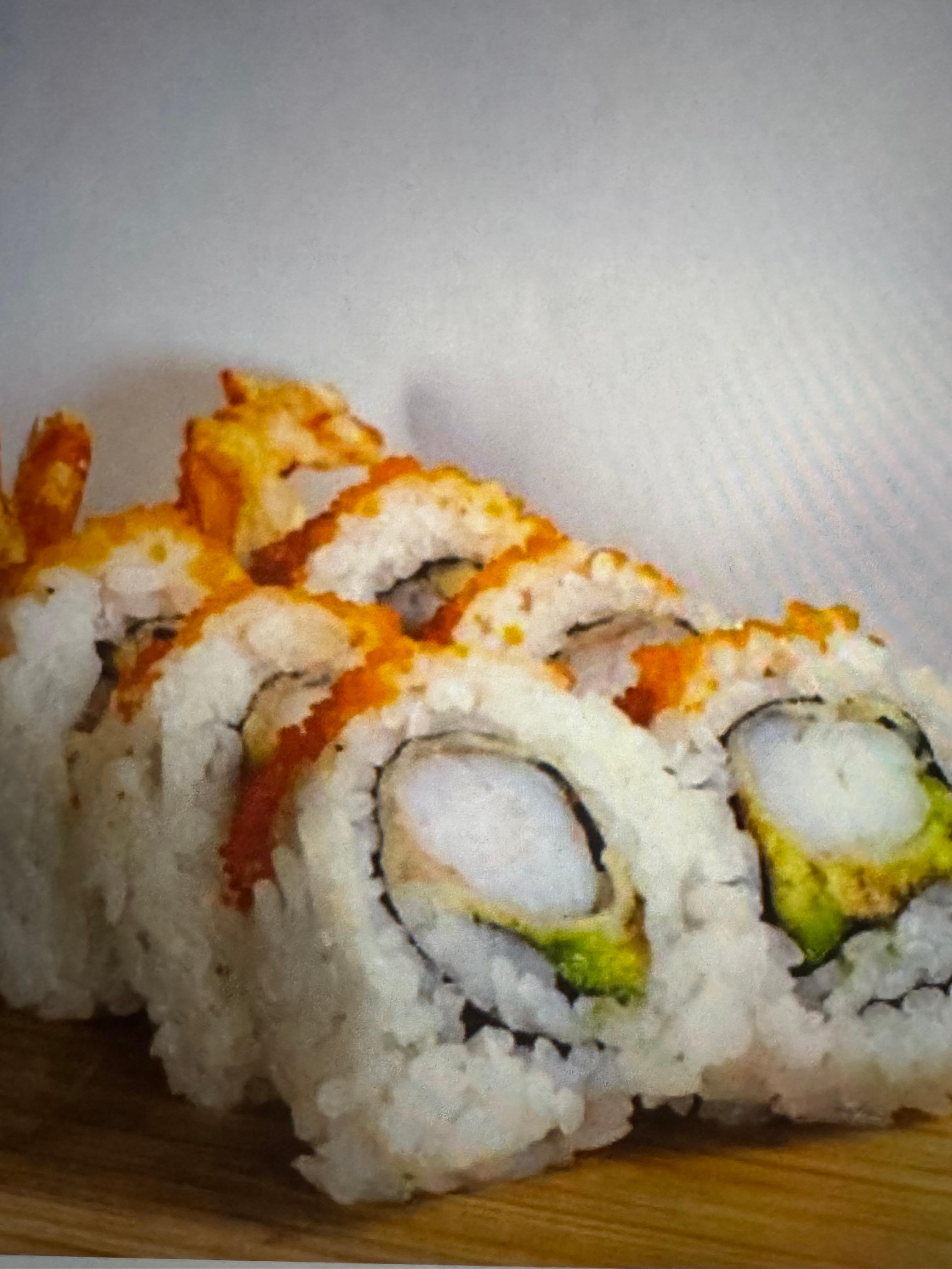 Panko fried shrimp, carrot, avocado, and topped with smelt roe.