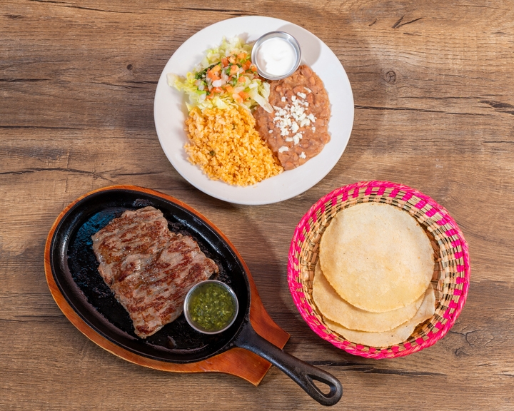 Skirt Steak topped with grilled onions. Served with rice, beans & tortillas.