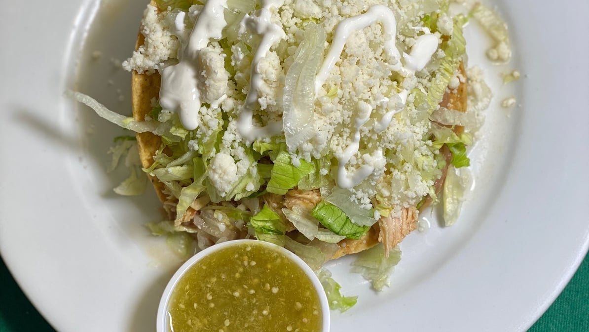 Hard flat tortilla topped with refried beans, lettuce, onions, cheese and sour cream
