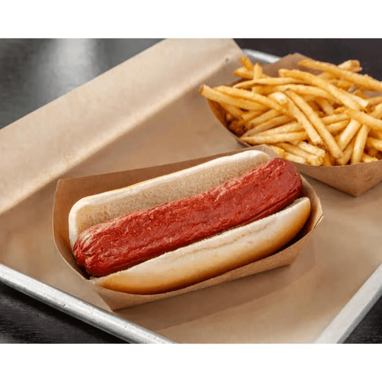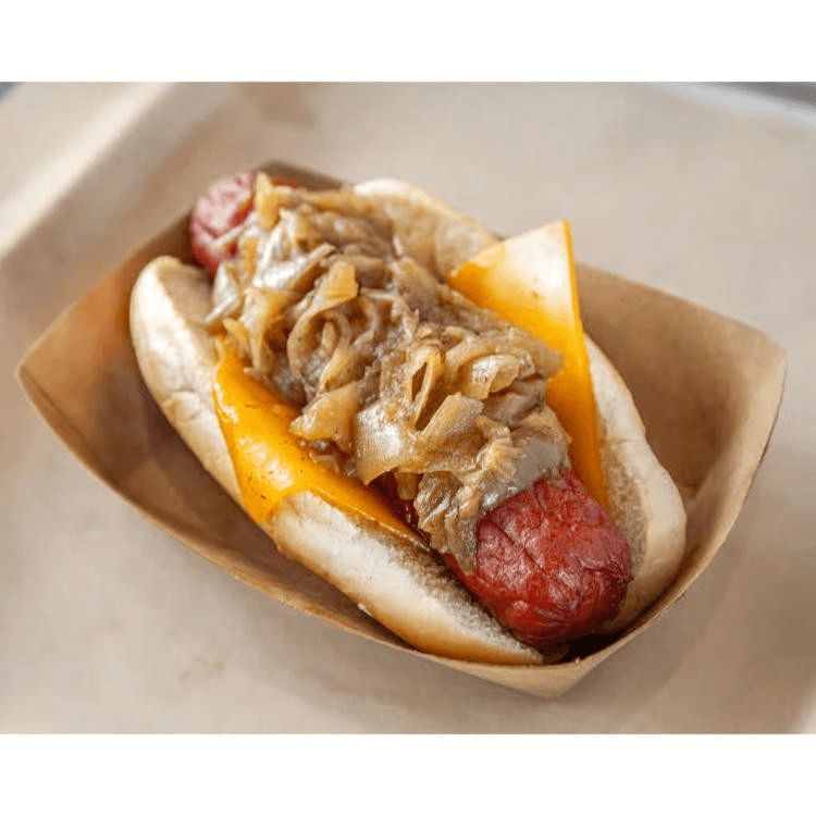 Beef hot dog wrapped in bacon, cheese, and caramelized onions.
