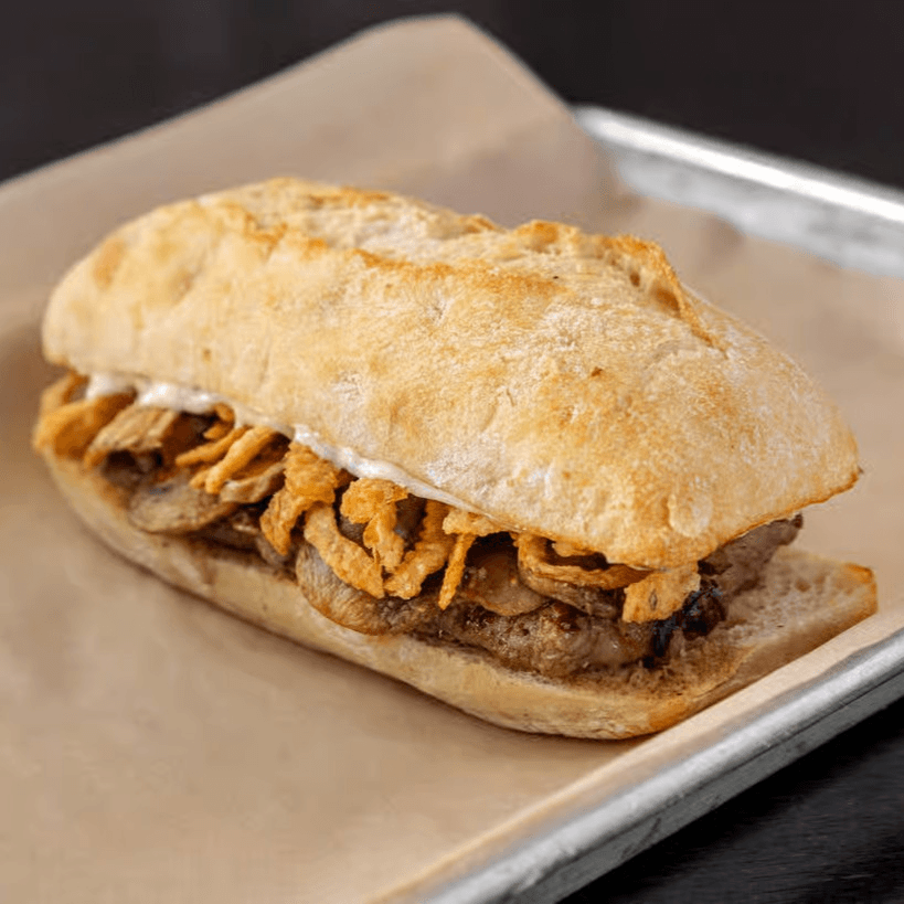 10oz New York strip, sautéed mushrooms, garlic herb mayo on demi baguette.