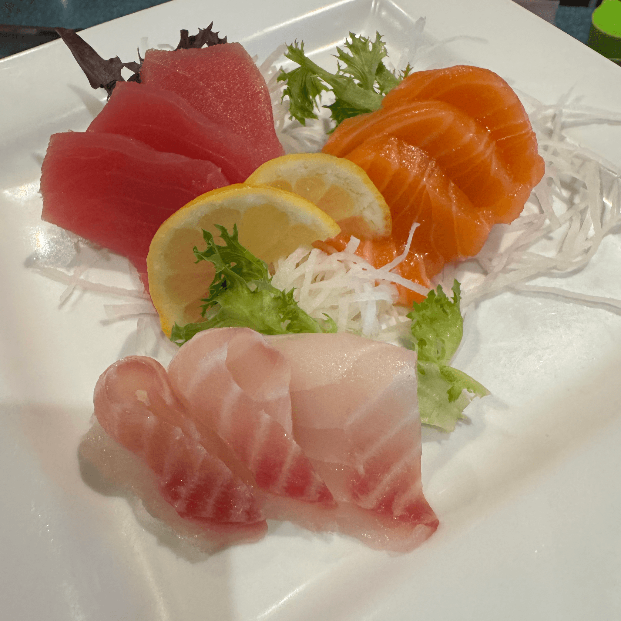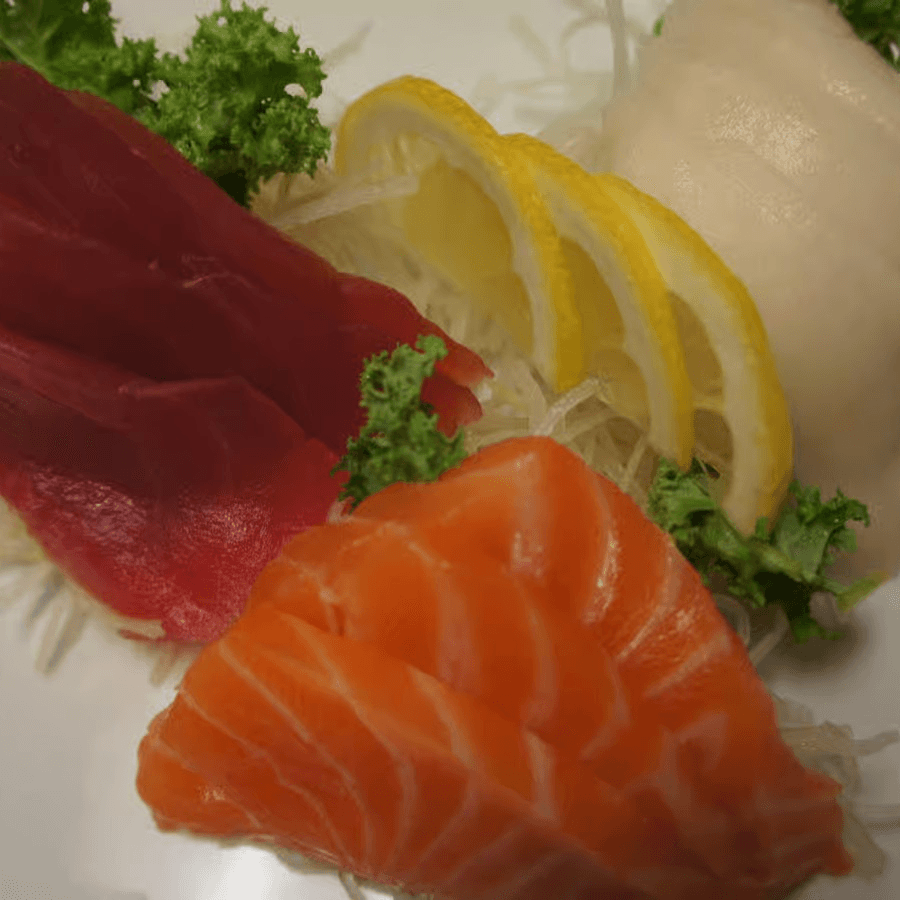 9 pieces sashimi - tuna, salmon, white fish, 3 pieces each. Served with miso soup or ginger salad