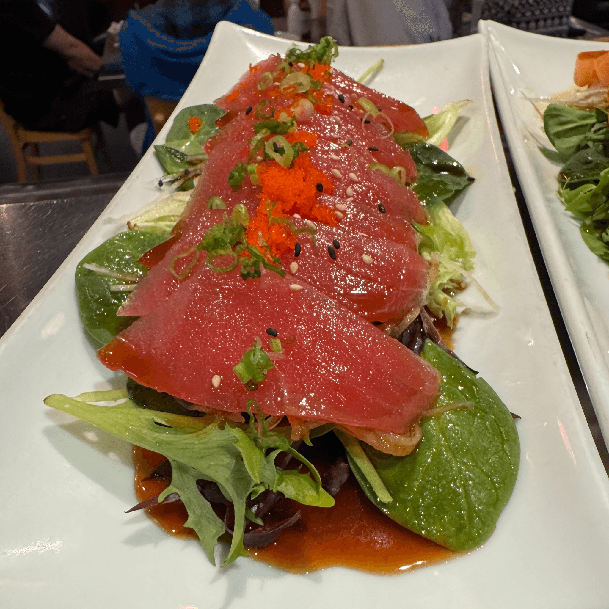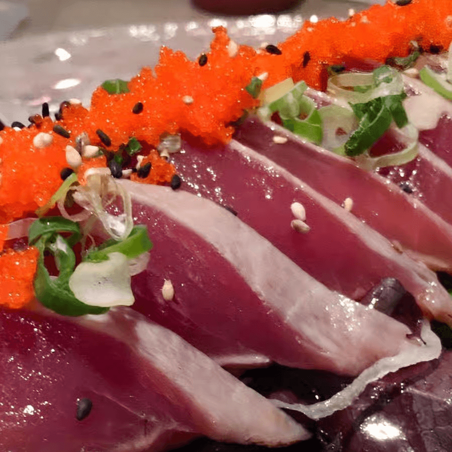 Seared tuna served on mixed greens with scallion, roe & tataki sauce