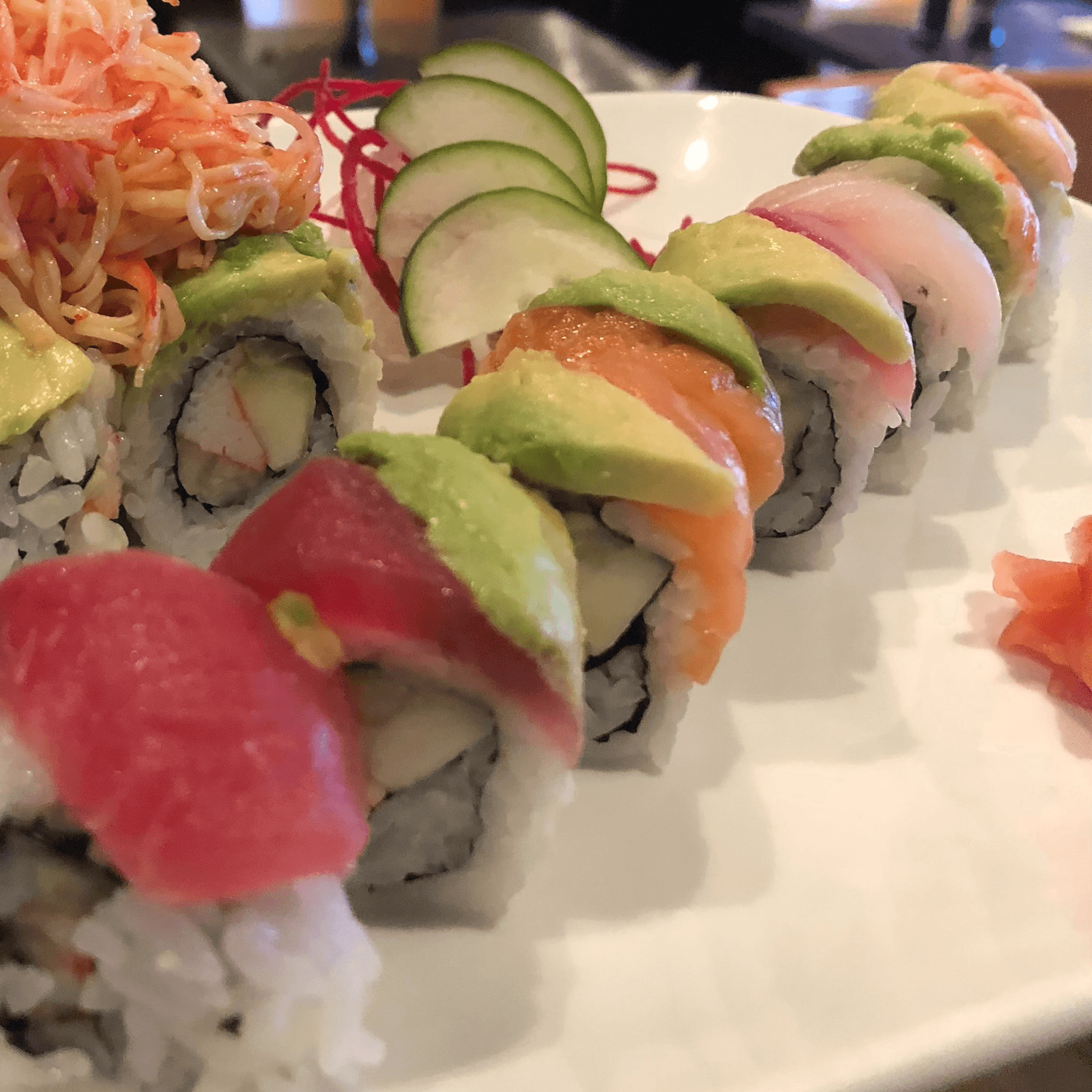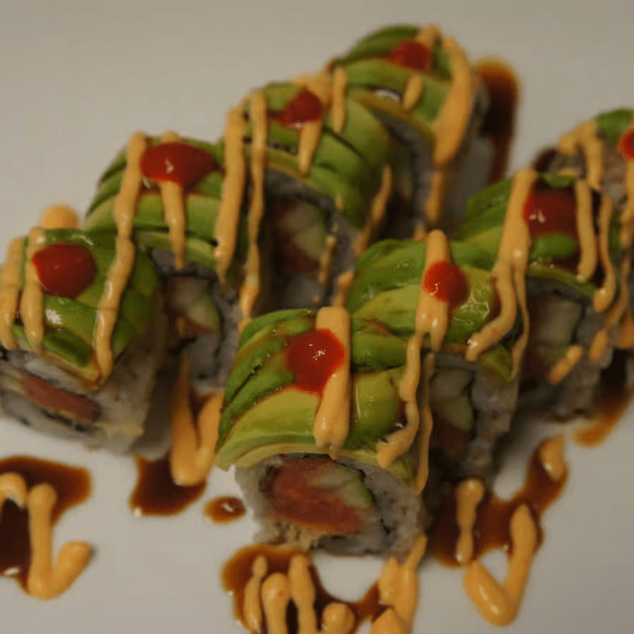 Spicy crunchy tuna & cucumber topped with avocado & sriracha, spicy mayo & eel sauce