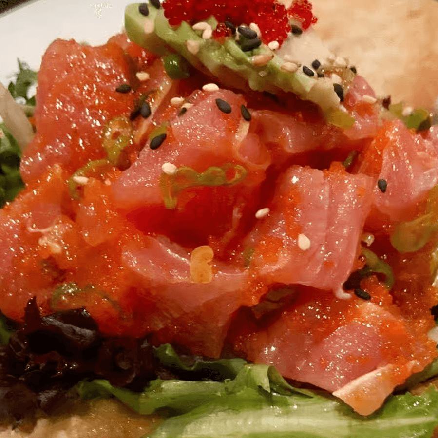 Spicy crunchy tuna topped with tuna finished with spicy mayo, scallion & roe