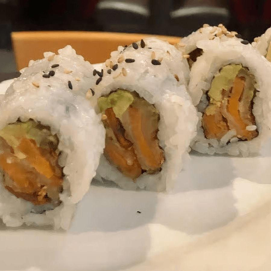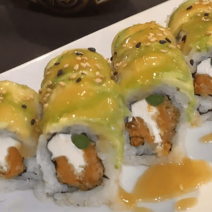 Fresh salmon, imitation crab, cream cheese, asparagus and avocado, tempura fried, eel sauce & spicy mayo