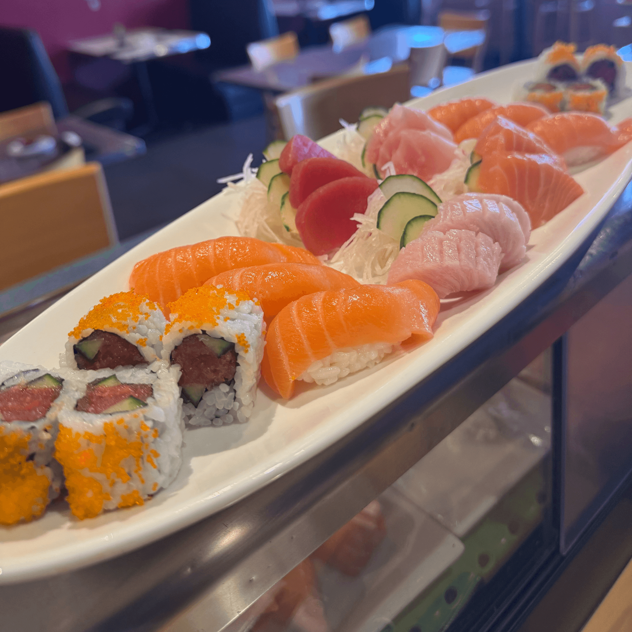 Choice of tuna, salmon, or yellowtail, cucumber or tempura chips, and roe