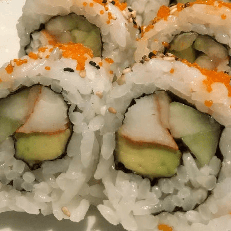 Imitation crab and cucumber wrapped with avocado topped with baked crab delight, spicy mayo & eel sauce