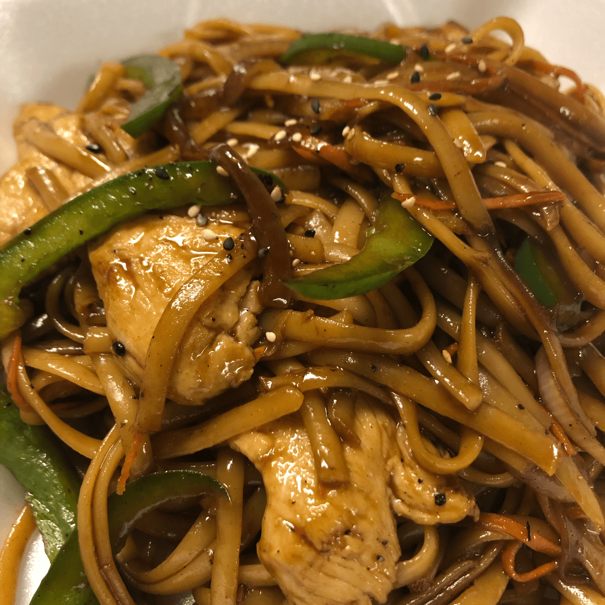 Seasoned grilled chicken skewers topped with teriyaki glaze and sesame seeds
