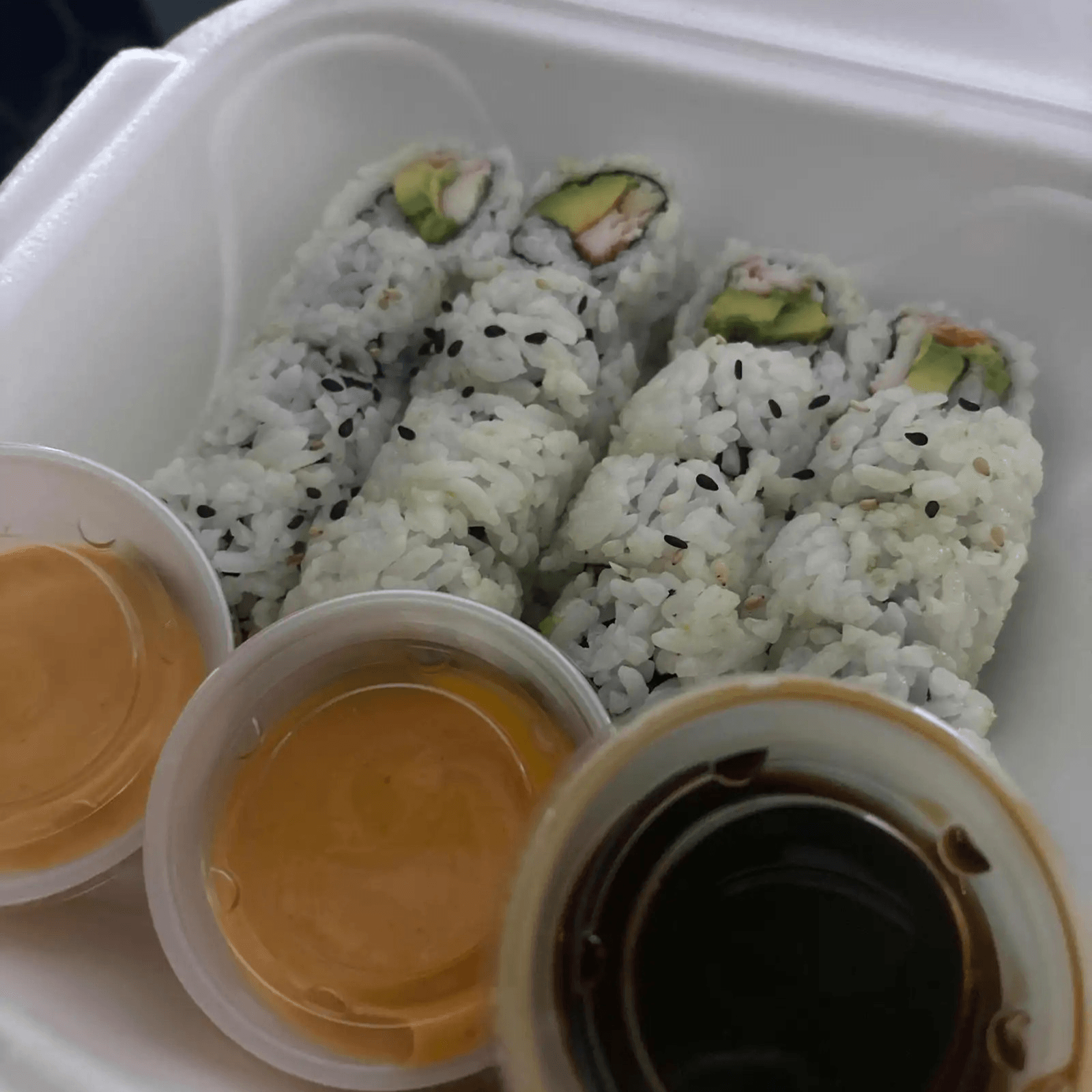 Includes 4 pieces of California, 2 pieces spring rolls, miso soup and ginger salad