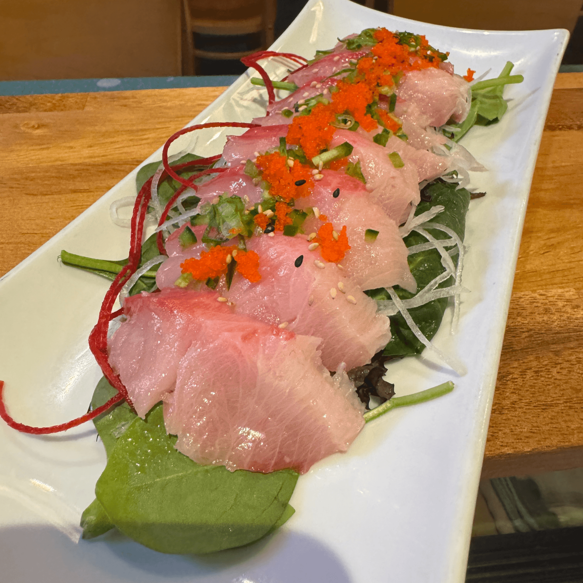 Yellowtail sashimi topped with jalapeño, scallion, roe, spicy ponzu