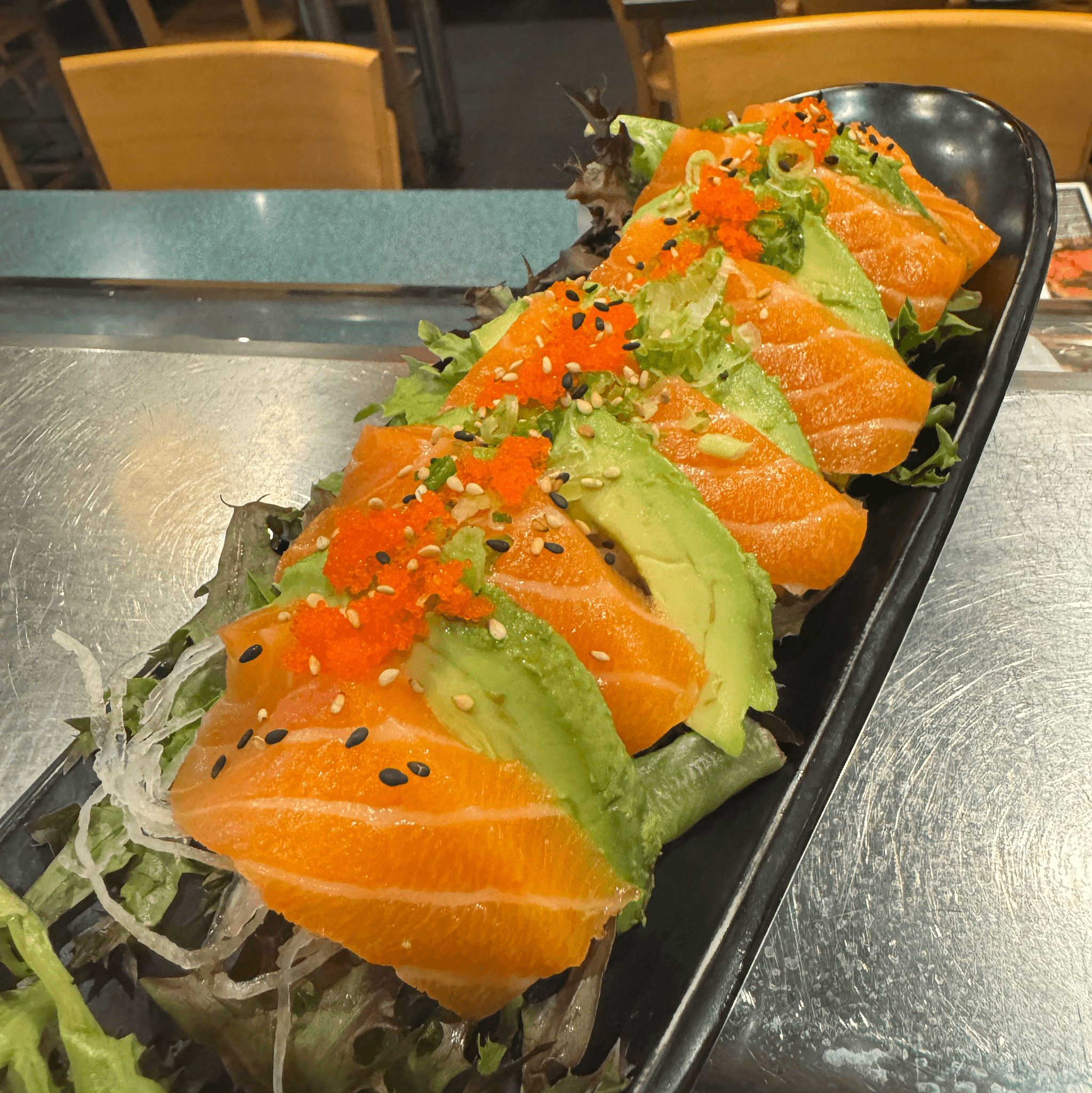 Fresh salmon sashimi & avocado served on mix greens scallion, roe, and ponzu sauce