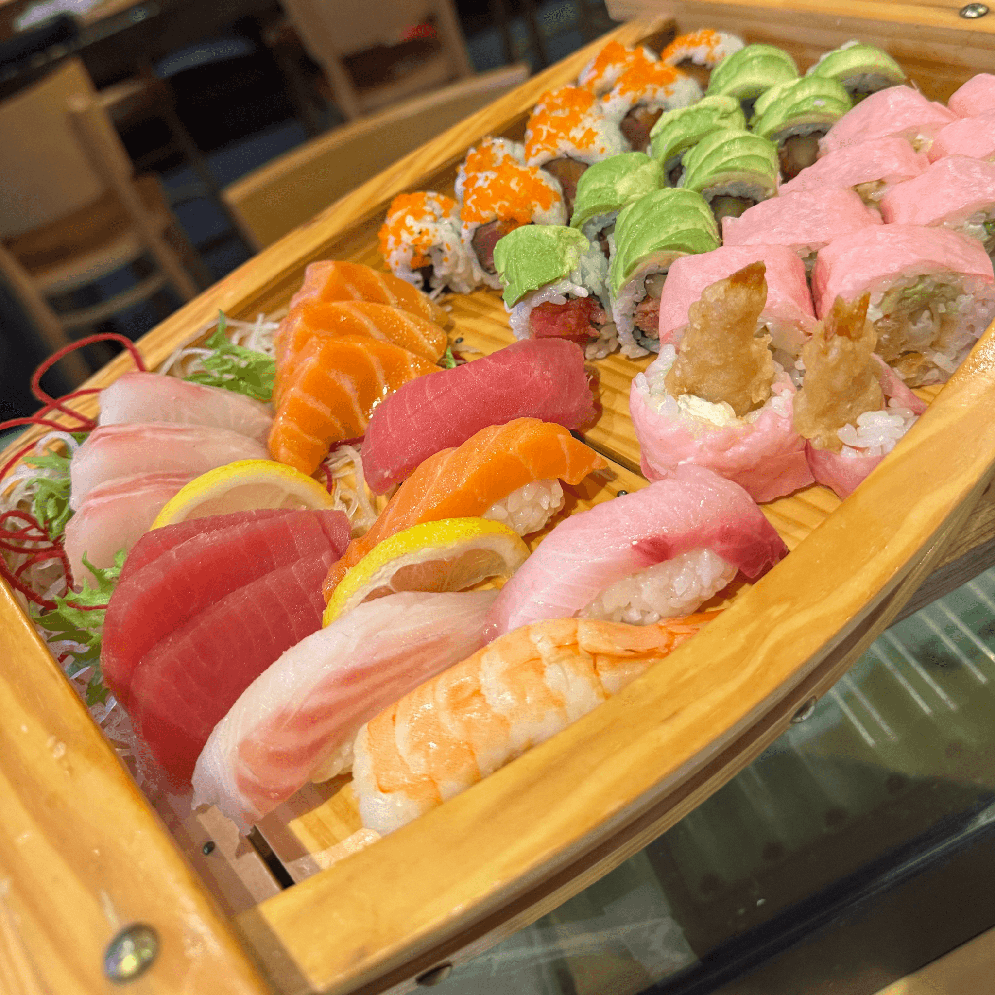 California roll topped with tuna, salmon, white fish, and avocado