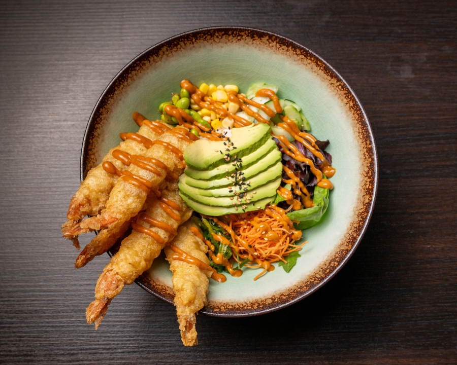 Tempura shrimp, avocado, carrots, cucumber, corn, edamame peas, wakame, spring mix, tempura chips, coconut-sriracha sauce served over seasoned sesame sushi rice (contains almond butter)