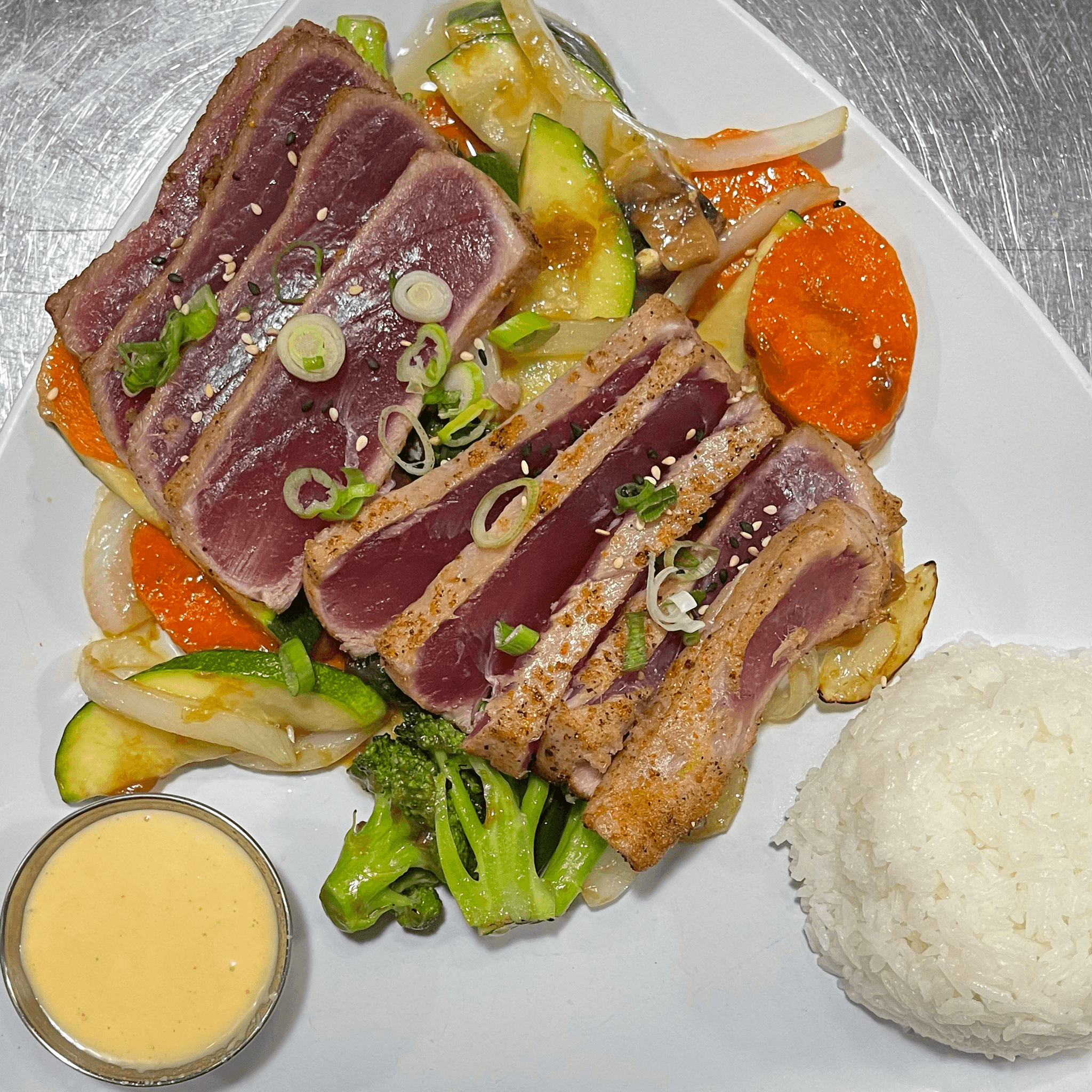 Choice of: (Chicken 20.00, Sirloin 21.50, Shrimp 23.00, Salmon 24.00) w/ steamed rice, stir fried-vegetables, & choice of house salad or miso soup