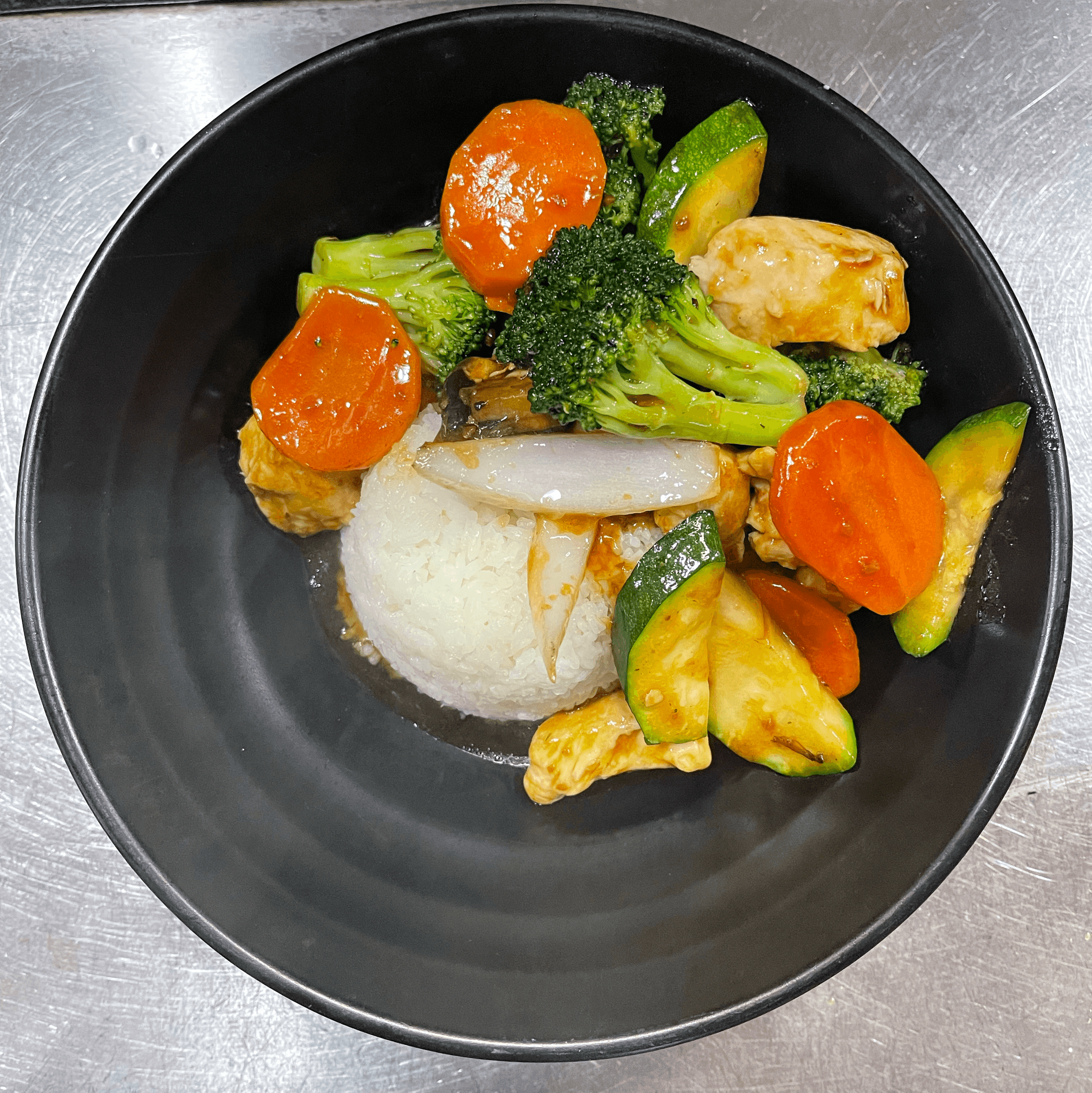 Choice of protein, udon noodles, stir-fry vegetables, tokyo sauce