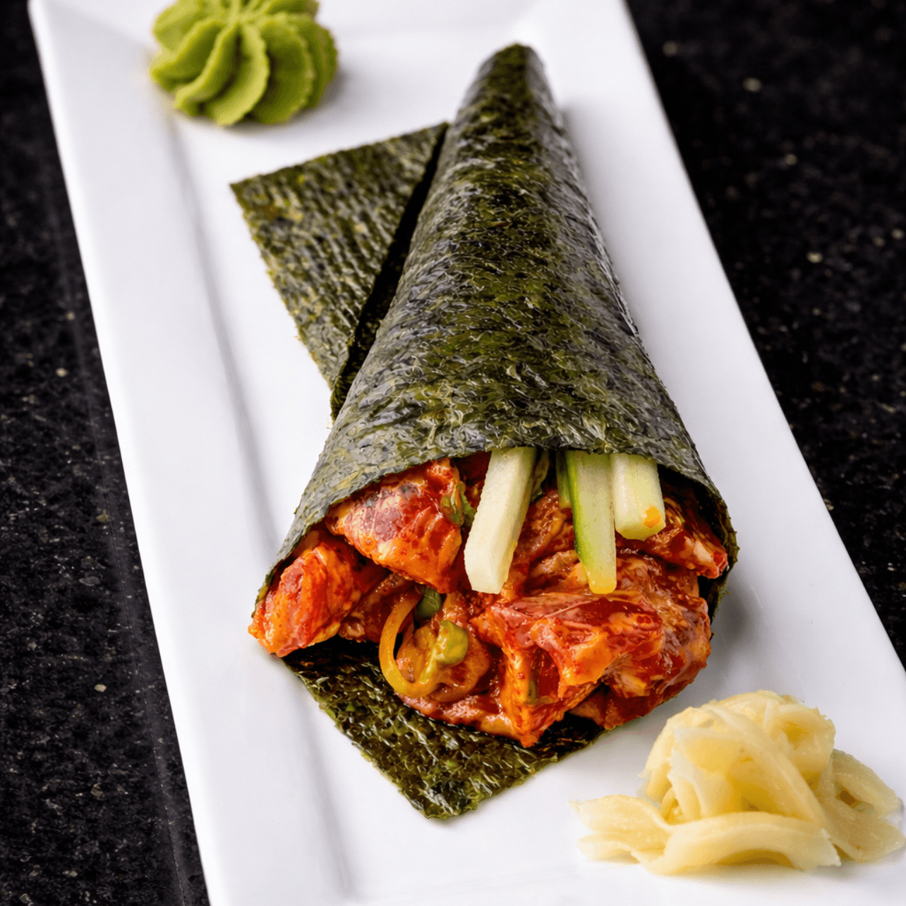 Pink soy paper, spicy salmon mix, tempura shrimp, krab delight, cream cheese, asparagus, scallion, spicy-garlic teriyaki sauce