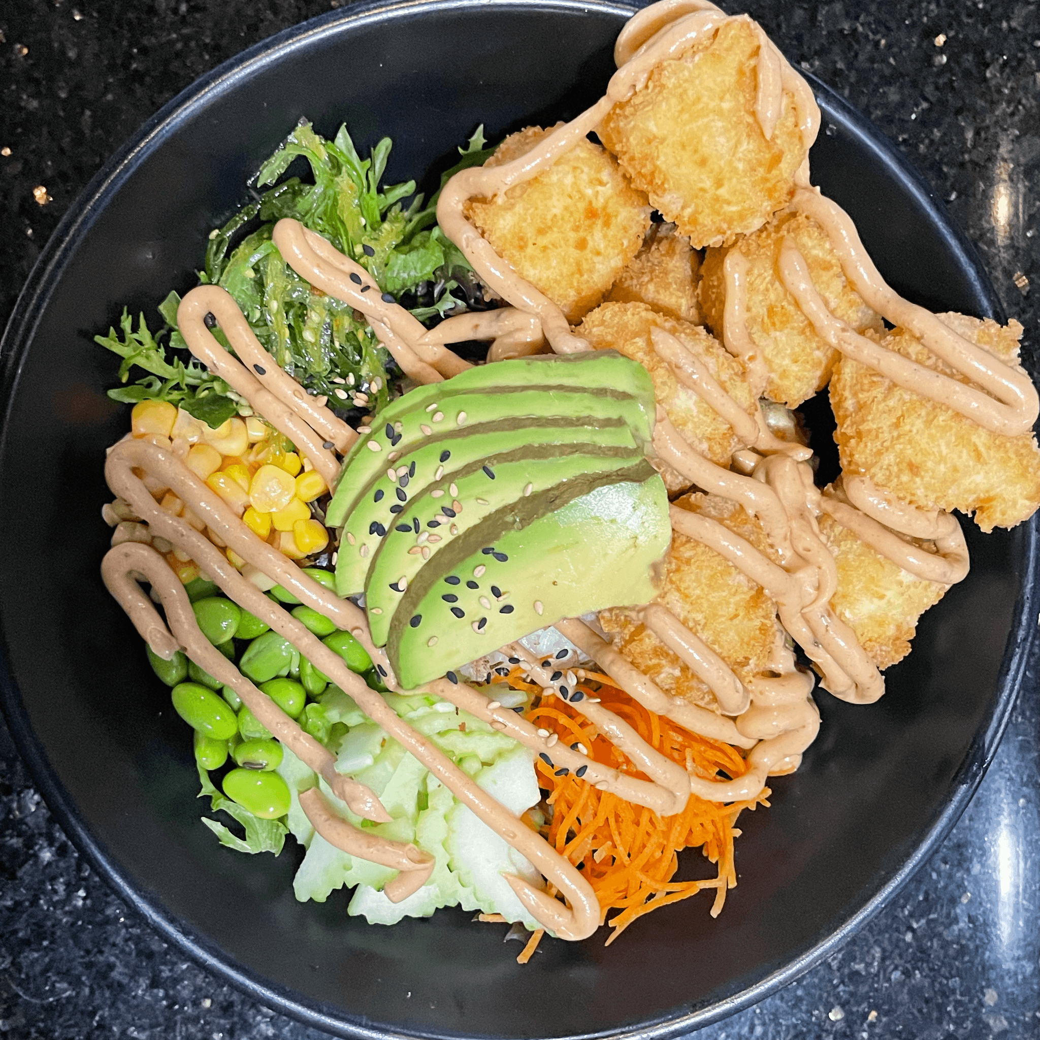 Fried tofu or panko chicken, bean sprouts, avocado, carrots, cucumber, corn, edamame peas, wakame, spring mix, tempura chips, creamy Thai-peanut sauce served over seasoned sesame sushi rice (contains peanut butter)