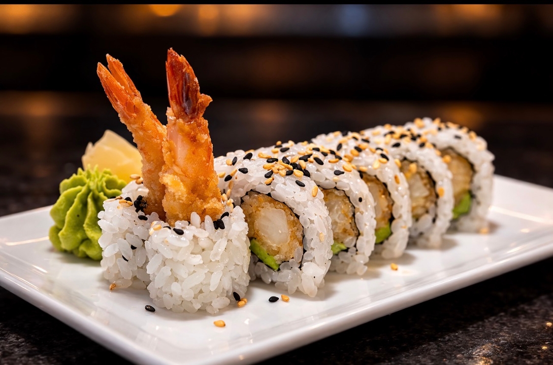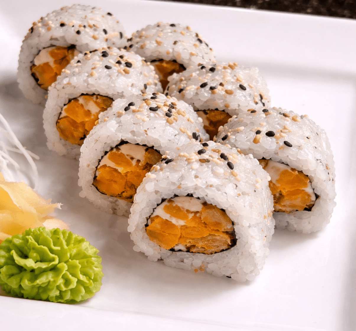 Krab delight, cucumber, tempura shrimp, scallions, fried crispy onions, creamy ‘Boom- Boom’ sauce