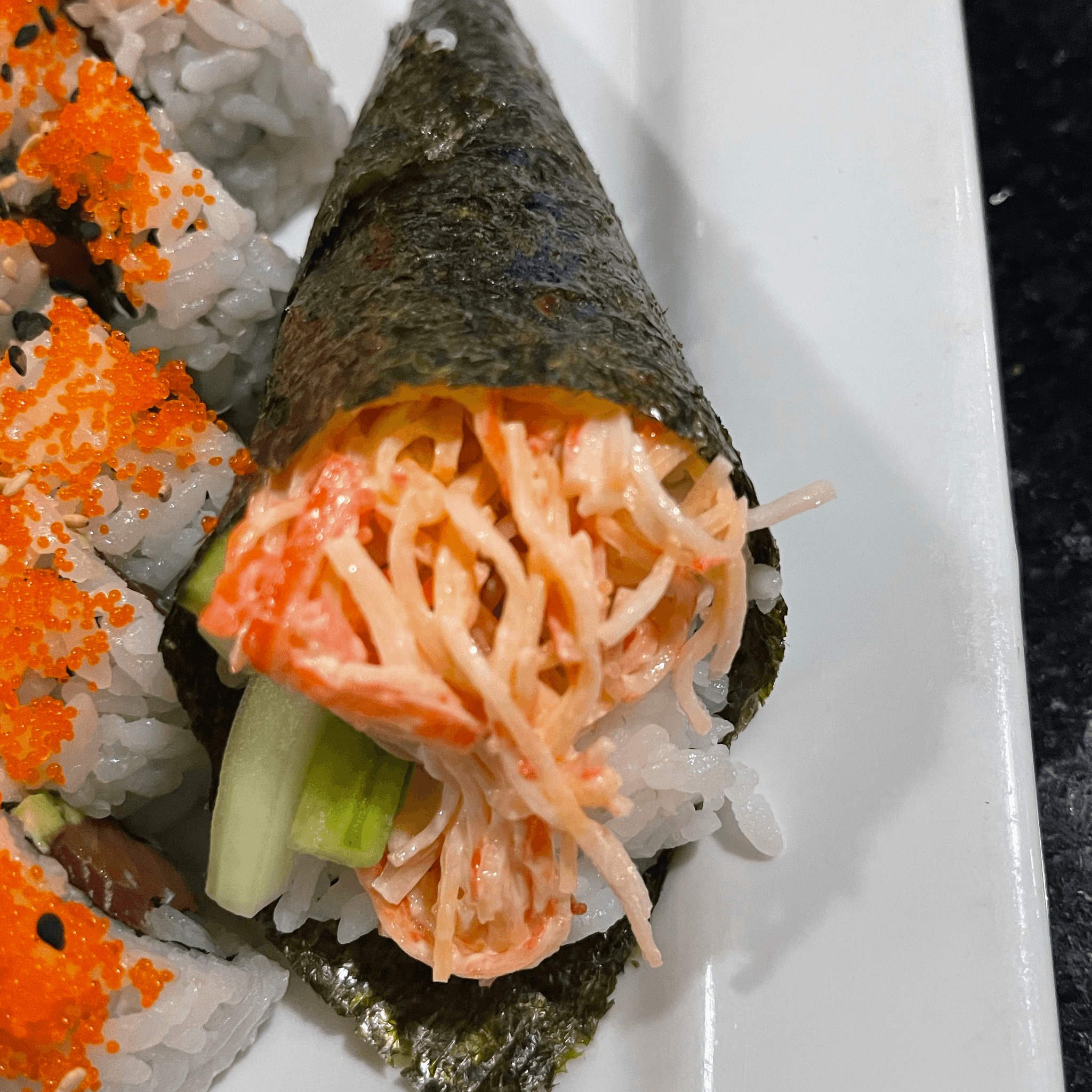 Krabstick, shrimp, cucumber, kelp, smelt roe, scallions, sesame seeds, sunomono vinaigrette
