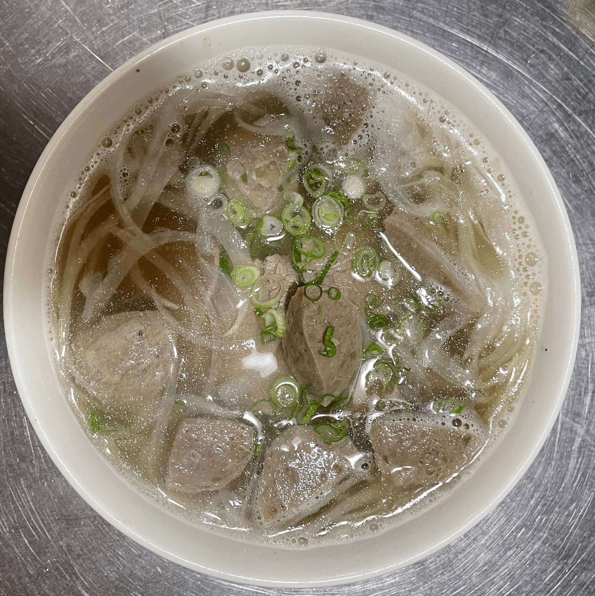 Beef broth, rice noodles, rare sliced beef, meat balls, onions, scallion, side of Vietnamese herbs, hoisin sauce, sriracha sauce