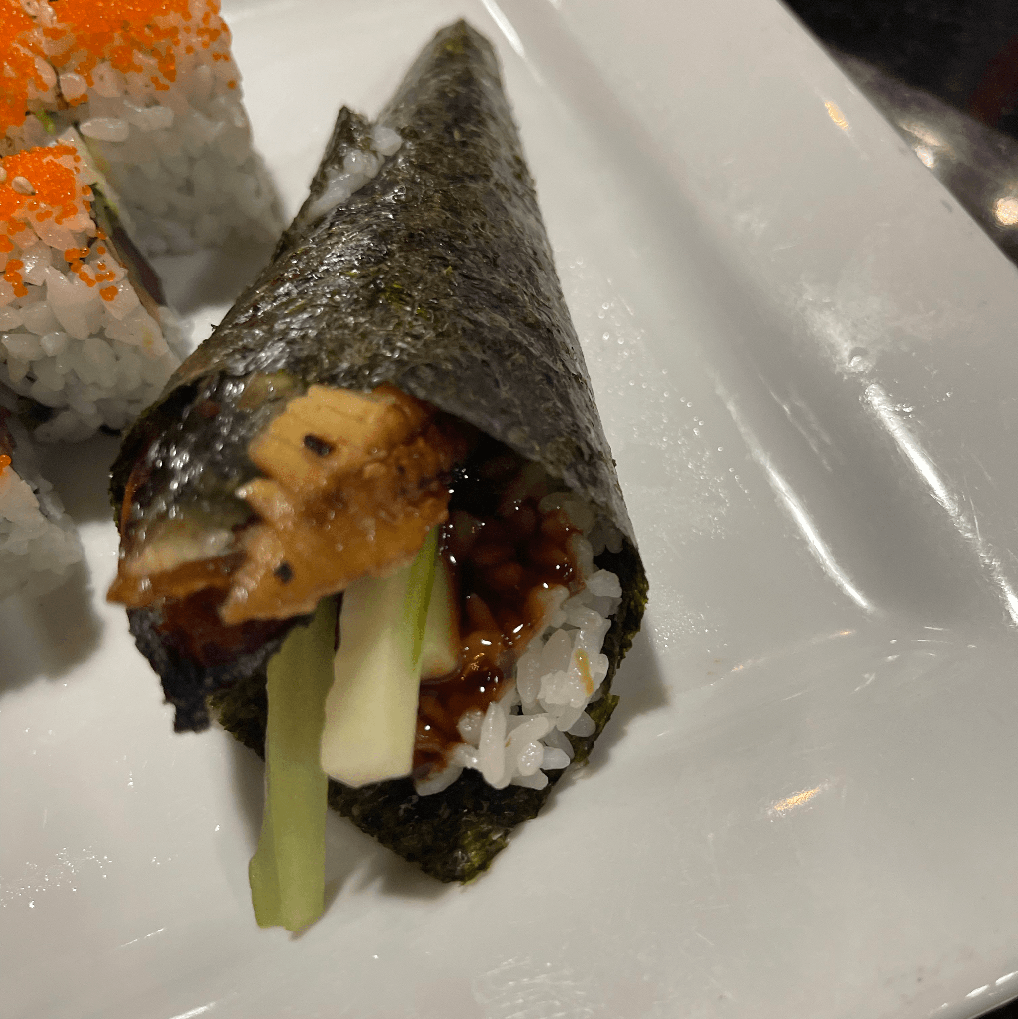 Fried roll, salmon, cream cheese, spicy mayo, eel sauce