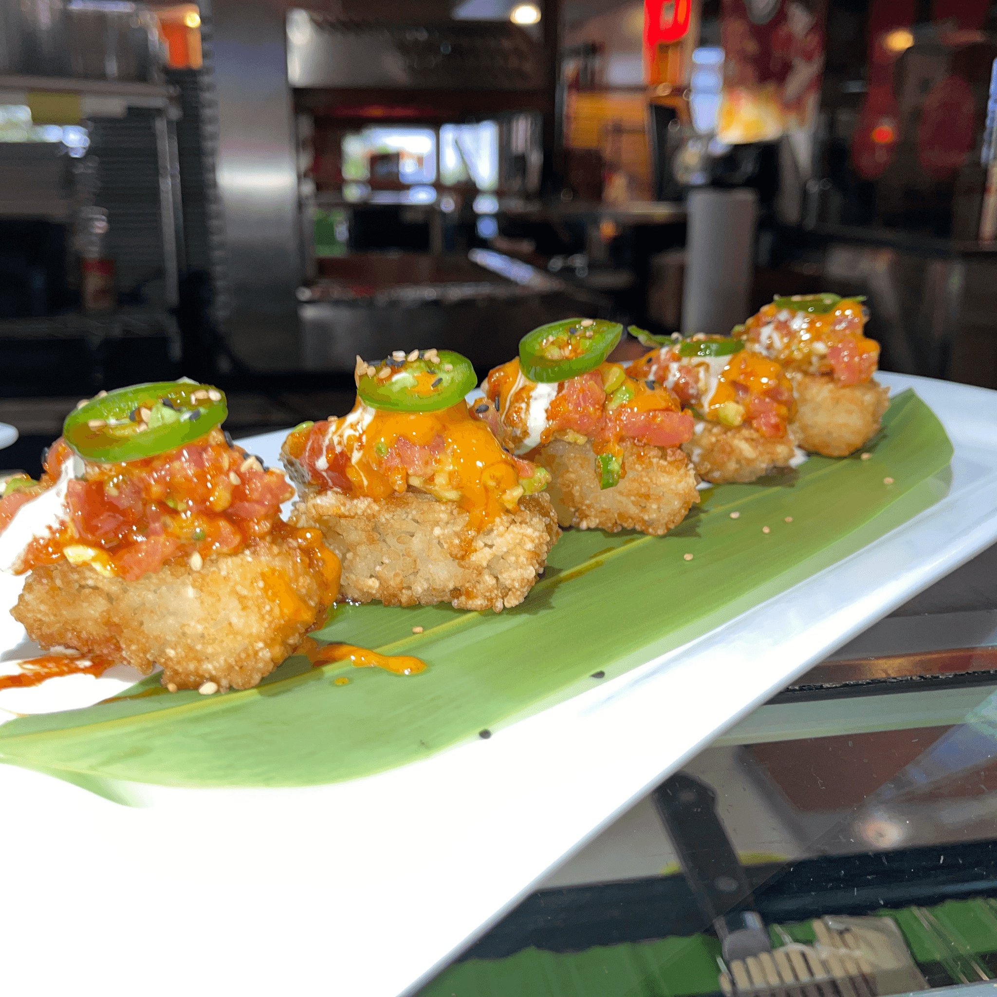 Crispy rice nigiri topped with spicy tuna, avocado, jalapeño, sesame seeds, wasabi cream sauce, hot honey drizzle