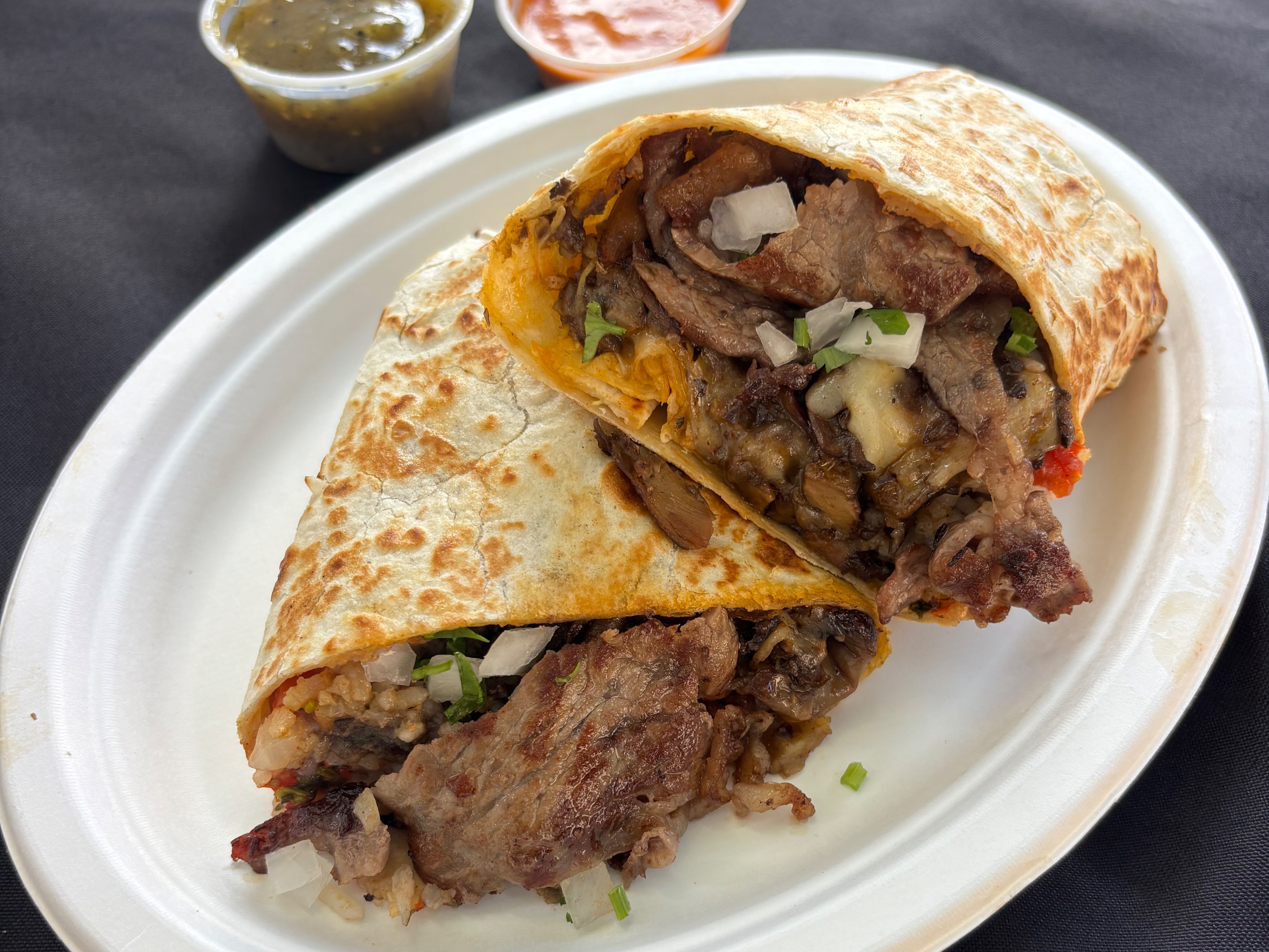 Grilled wild oyster mushrooms, cheese (vegan cheese option available), pico de gallo, shredded cabbage in an X-Large flour burrito. Add Rice & Beans (vegan) inside Burrito option available