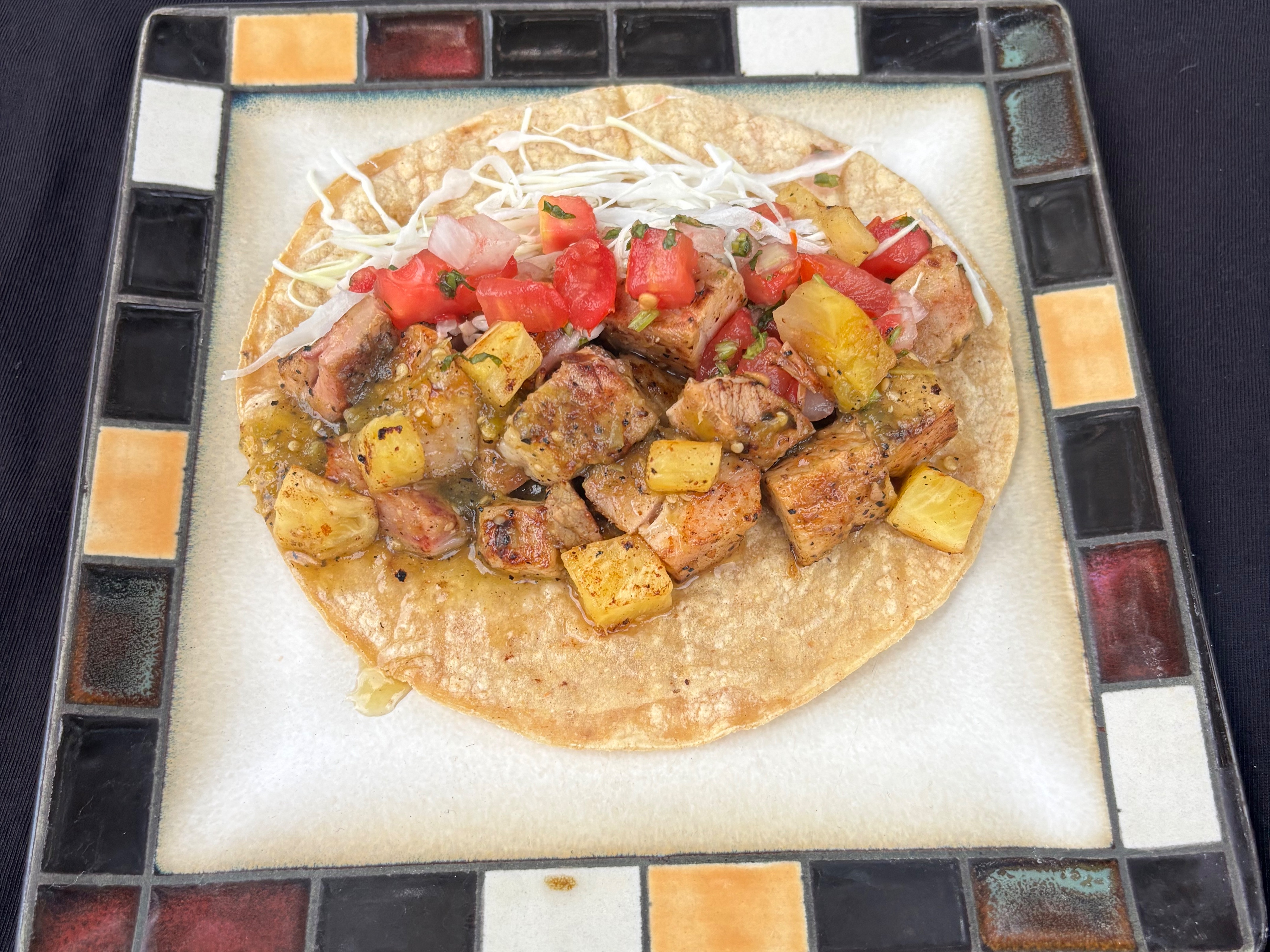 Grilled seasoned pork loin, roasted pineapple, pico de gallo and shredded cabbage in a warm tortilla. Choice corn or flour tortilla.