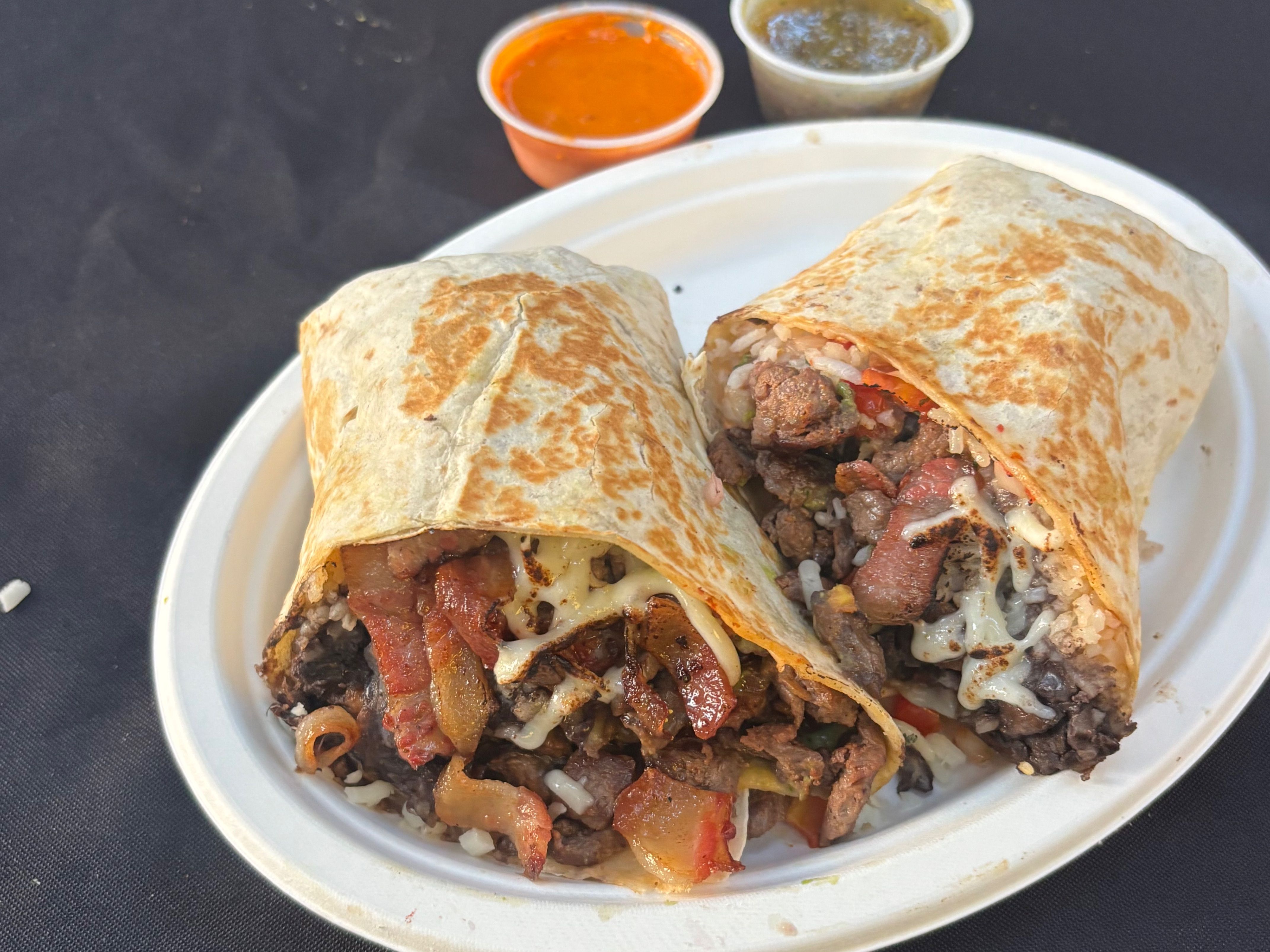 Grilled beef Carne Asada Steak & house made bacon, cheese, pico de gallo, shredded cabbage in an X-Large flour tortilla. Add Rice & Beans inside burrito option available