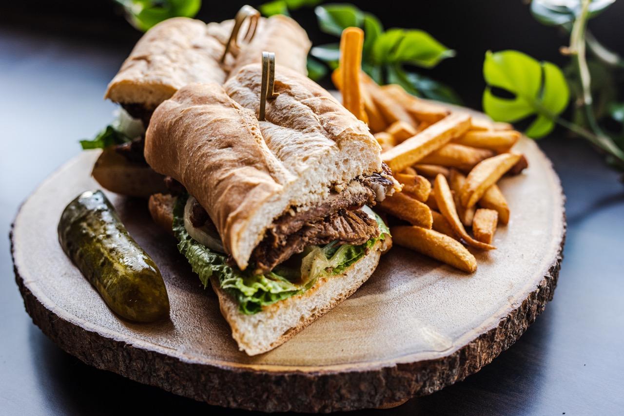 thinly sliced prime rib, horseradish, lettuce, onion, tomato