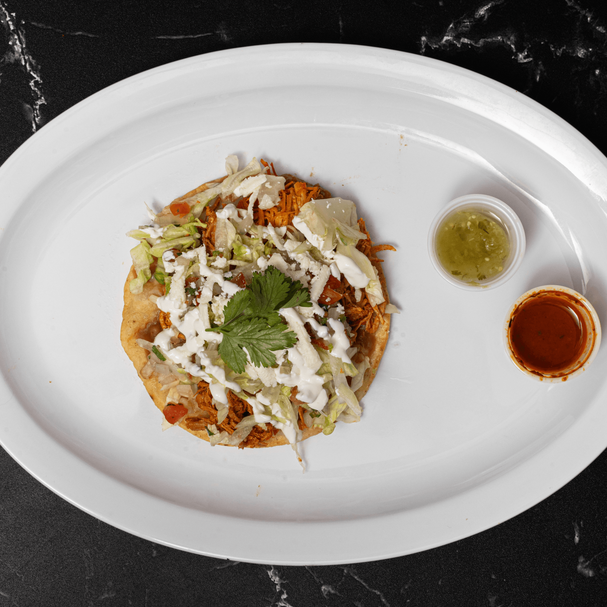 Thick oval-shaped masa cakes topped with choice of meat, beans, cheese, onions, cilantro & sour cream