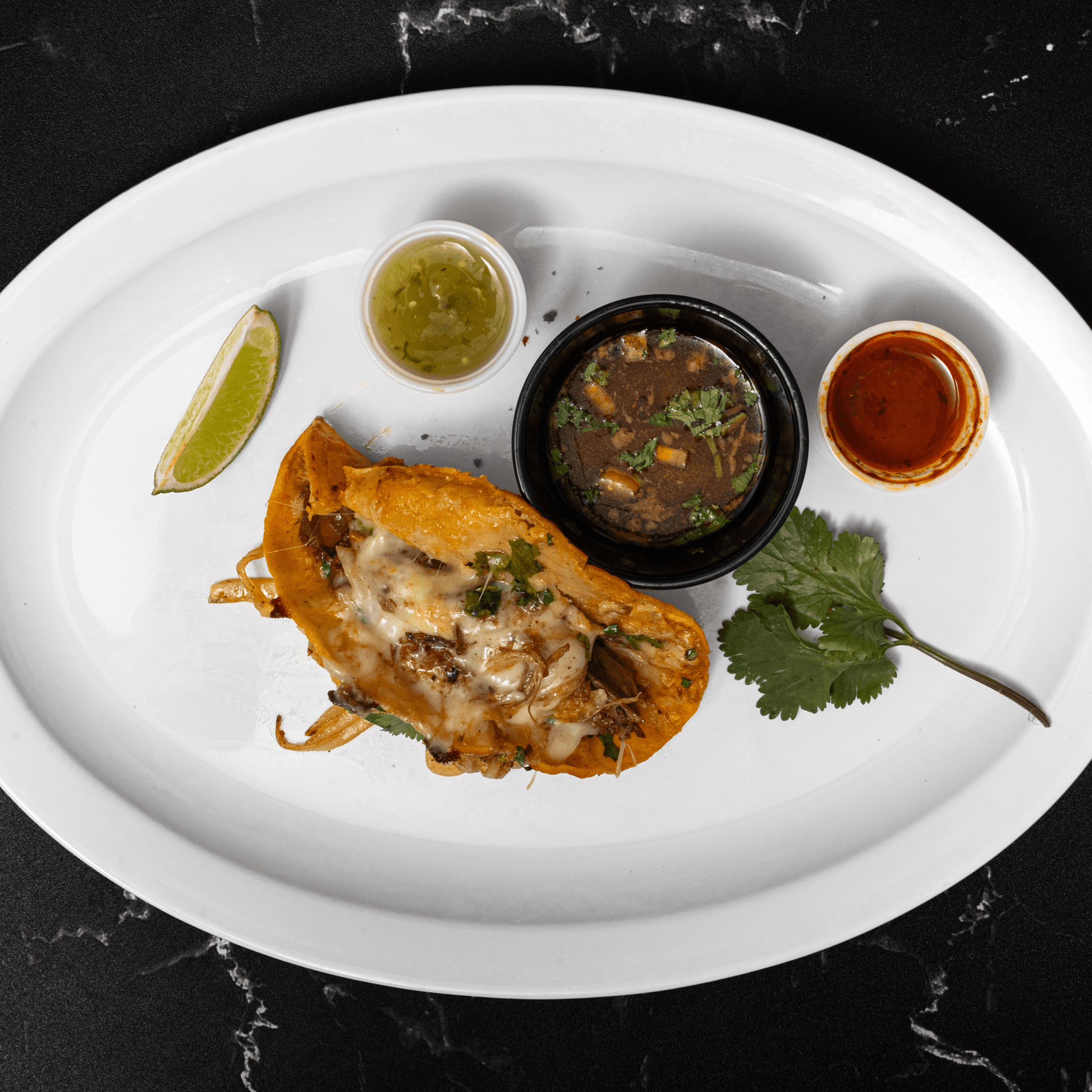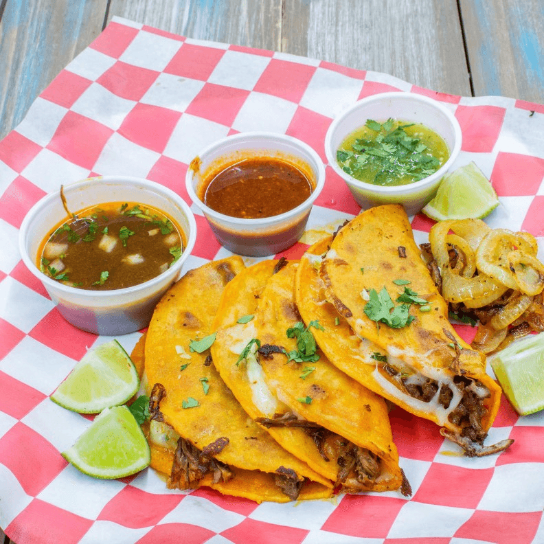 Quesabirria tacos with crunchy tortilla, tender meat and melty cheese. Served with extra stew broth for an easy dipping sauce.
