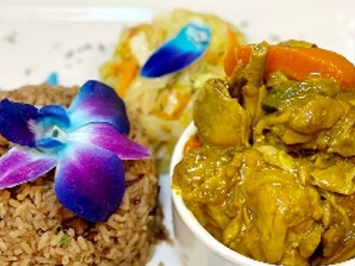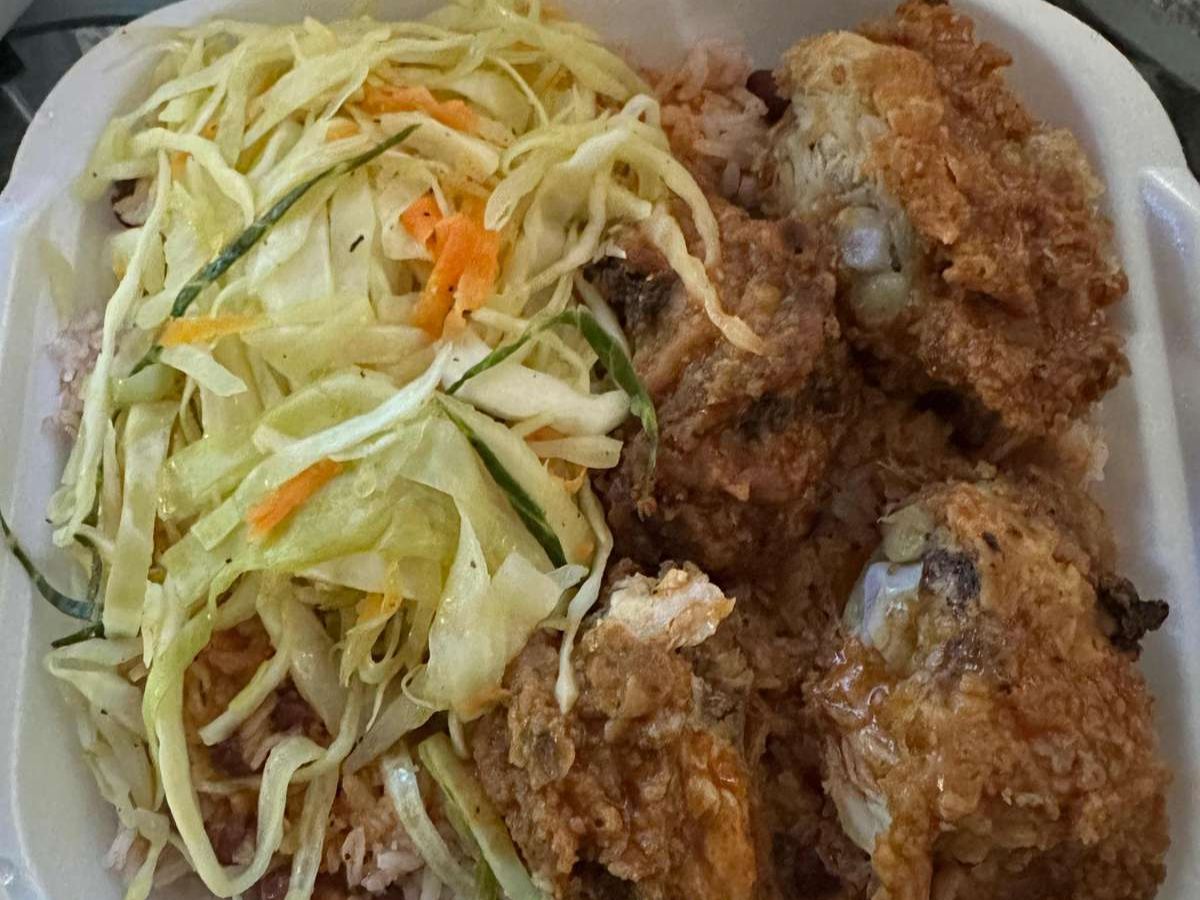 Choose two chicken: Prepared curry chicken, fried chicken, brown stew or jerk. Served with rice, steam cabbage or salad.