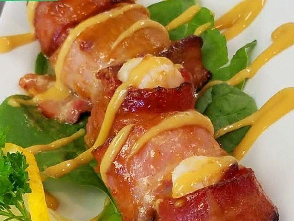 Three jumbo scallops wrapped in turkey bacon and pan seared to perfection.