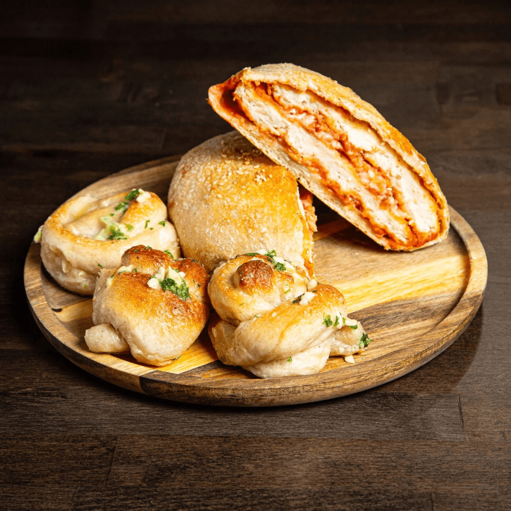 Breaded chicken with melted cheese Parmesan and mozzarella topped with tomato sauce inside of a dough shaped like a ball cooked in a high heat oven. It comes with 3 garlic knots