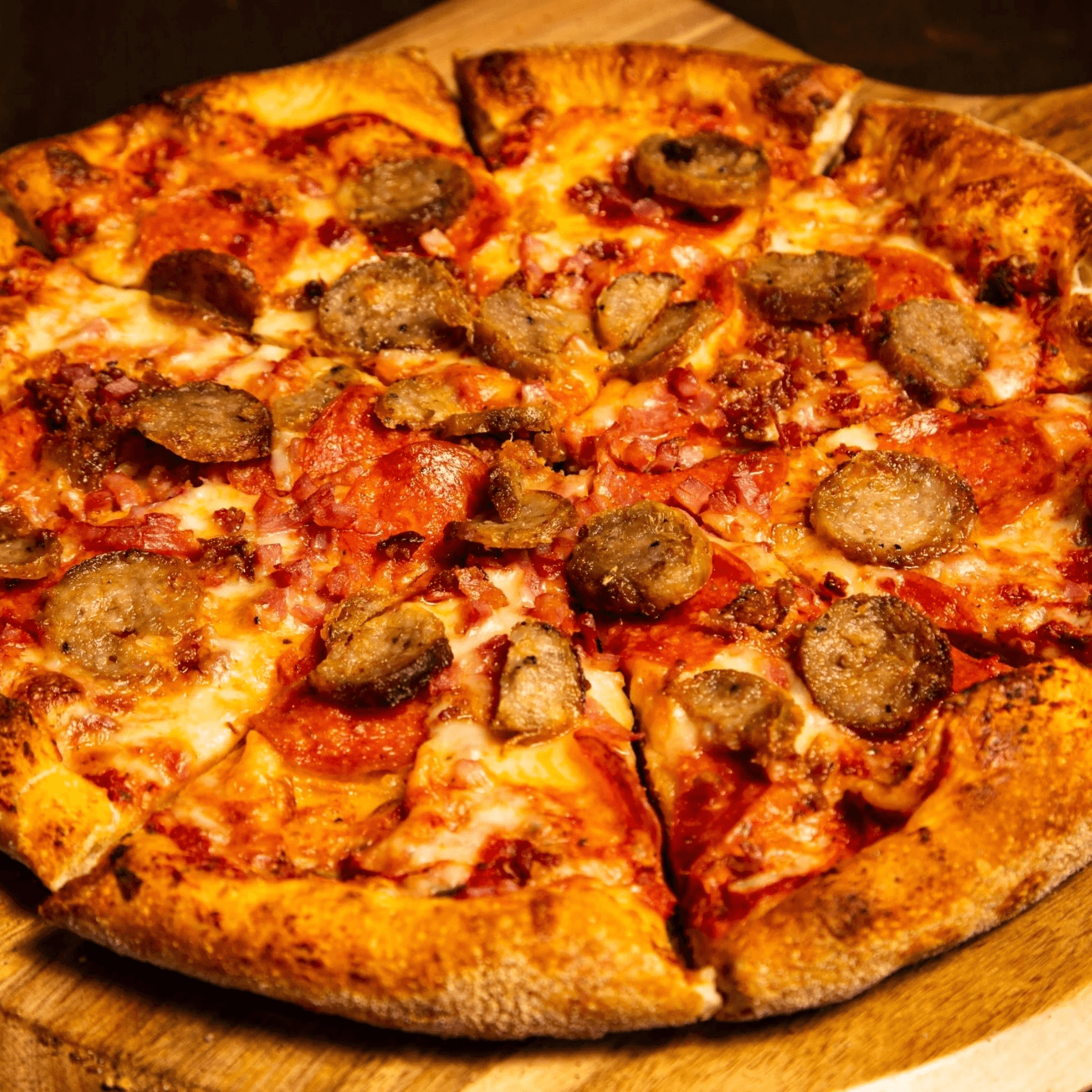 Tomato sauce, mozzarella, pepperoni, ham, sausage, and shredded bacon