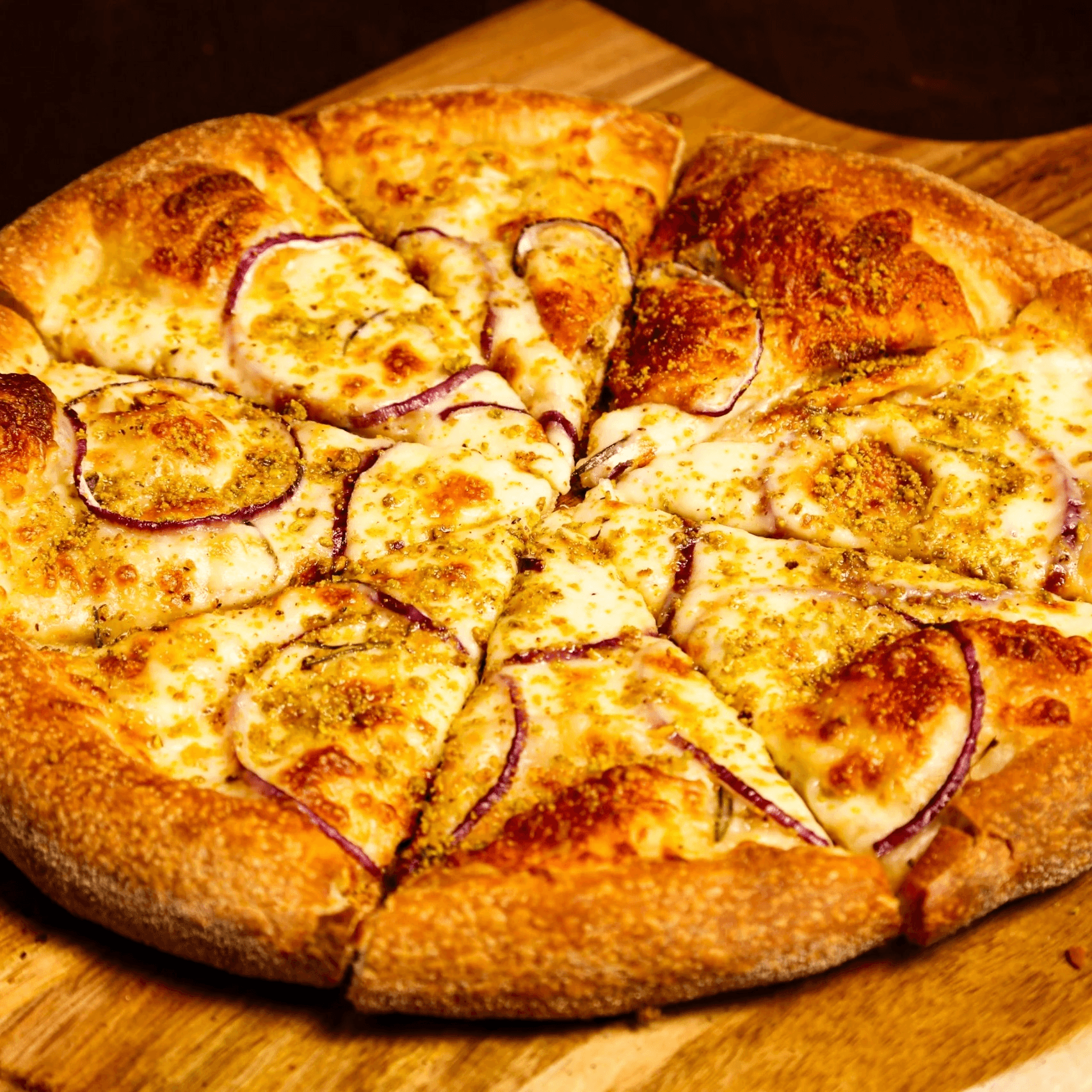 No base sauce, mozzarella, pistachio, red onion, Parmesan, rosemary, olive oil