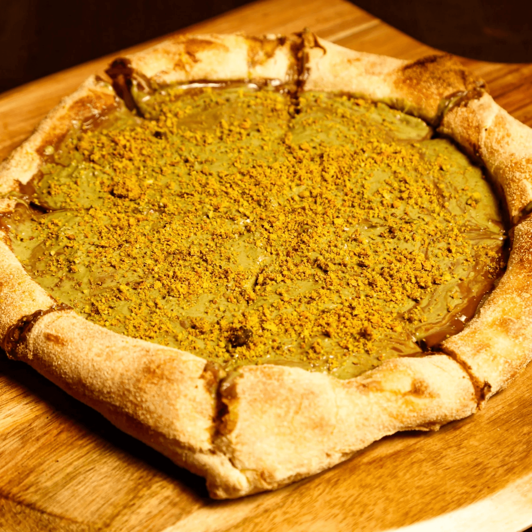 NY-style dough topped with a rich layer of Nutella and finished with crushed pistachios