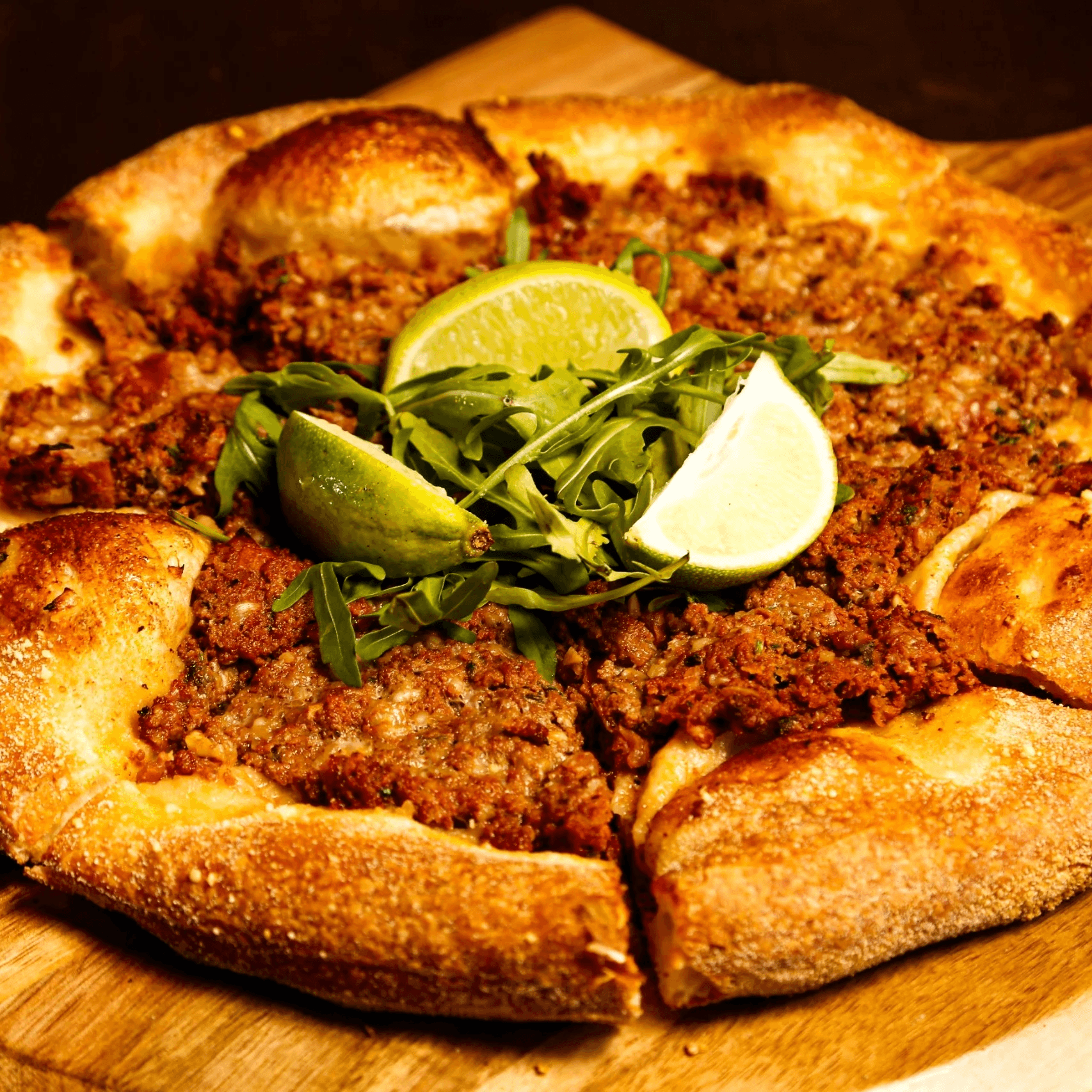 It's a traditional Middle Eastern classic reimagined with a NY twist. Topped with savory blend of spiced ground beef, parsley, onions and tomato mixed with Mediterranean spices and cooked over NY dough style pizza