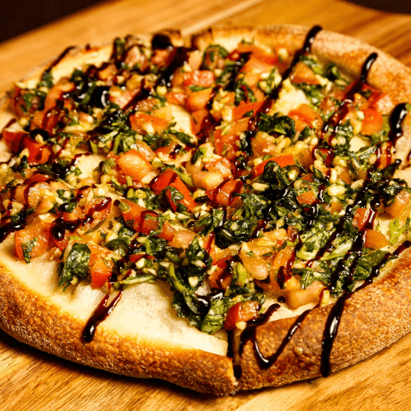 Chef favorite vegetarian pizza, tomato sauce, baked red onion, baked tomatoes, baked green pepper, mozzarella, black olives, topped with fresh basil