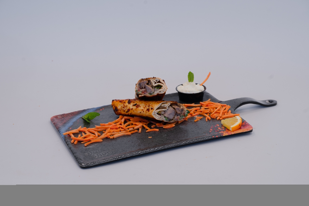 A very well marinated Charcoal grilled lamb cubes wrapped in Saj bread mixed with Tahini, tomatoes, onions & parsley