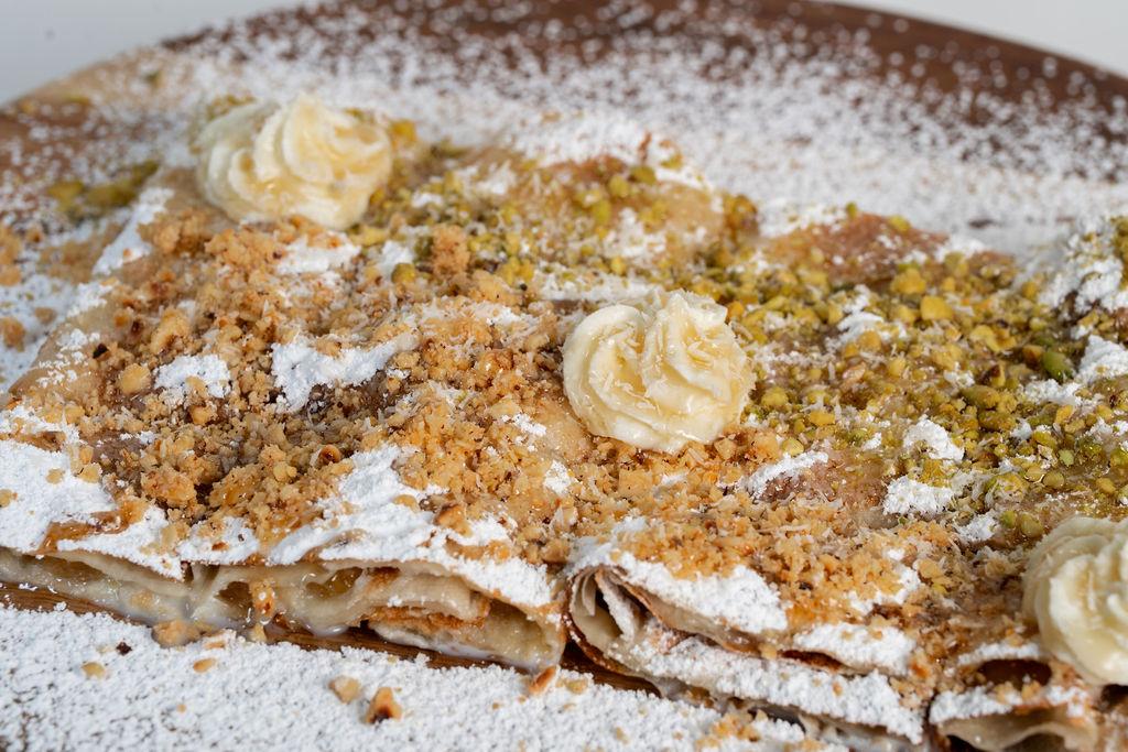 Authentic traditional layered dough like nothing you ever seen, crispy on the outside, soft on the inside, clay oven baked filled with custard, kunafa with pistachio & Nutella