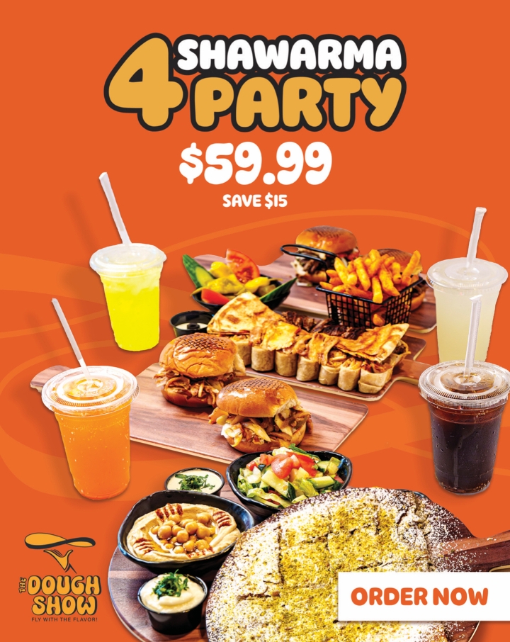 Get the full party box Double Shawarma Bites ( Mi x ) 2 beef Shawarma Buns 2 Chicken Shawarma Buns 2 Salads ( House Salad and Hummus ) 2 Dips ( Garlic - Tahini) and your choice of Dessert OR 4 Sodas