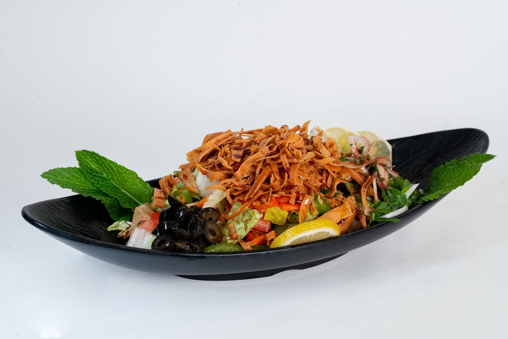 fresh lettuce, tomatoes, cucumbers, and radishes, as well as parsley and mint topped with toasted pita bread pieces, dressed with a lemon-sumac vinaigrette